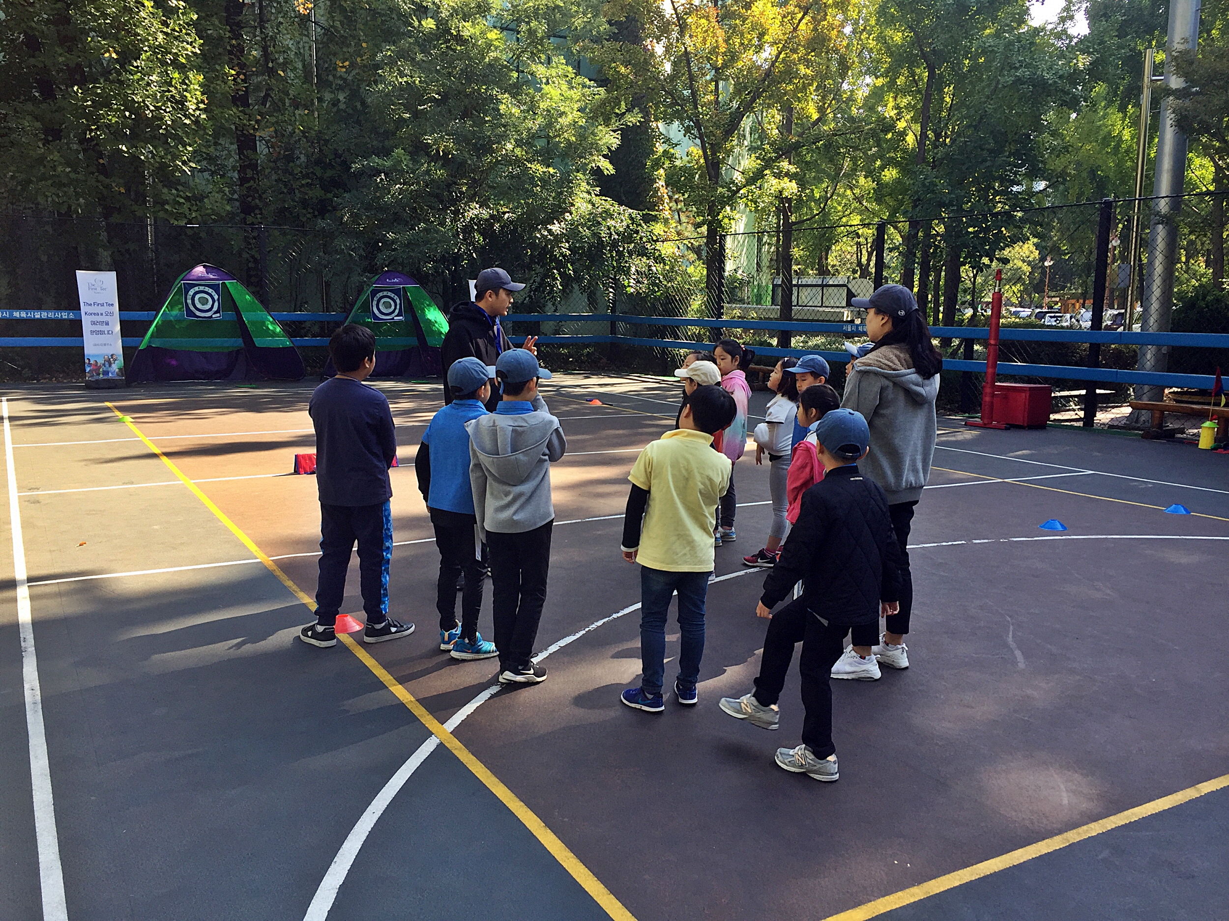팀별 퍼팅대항전을 실시 하기전 설명을 듣고 있는 아이들