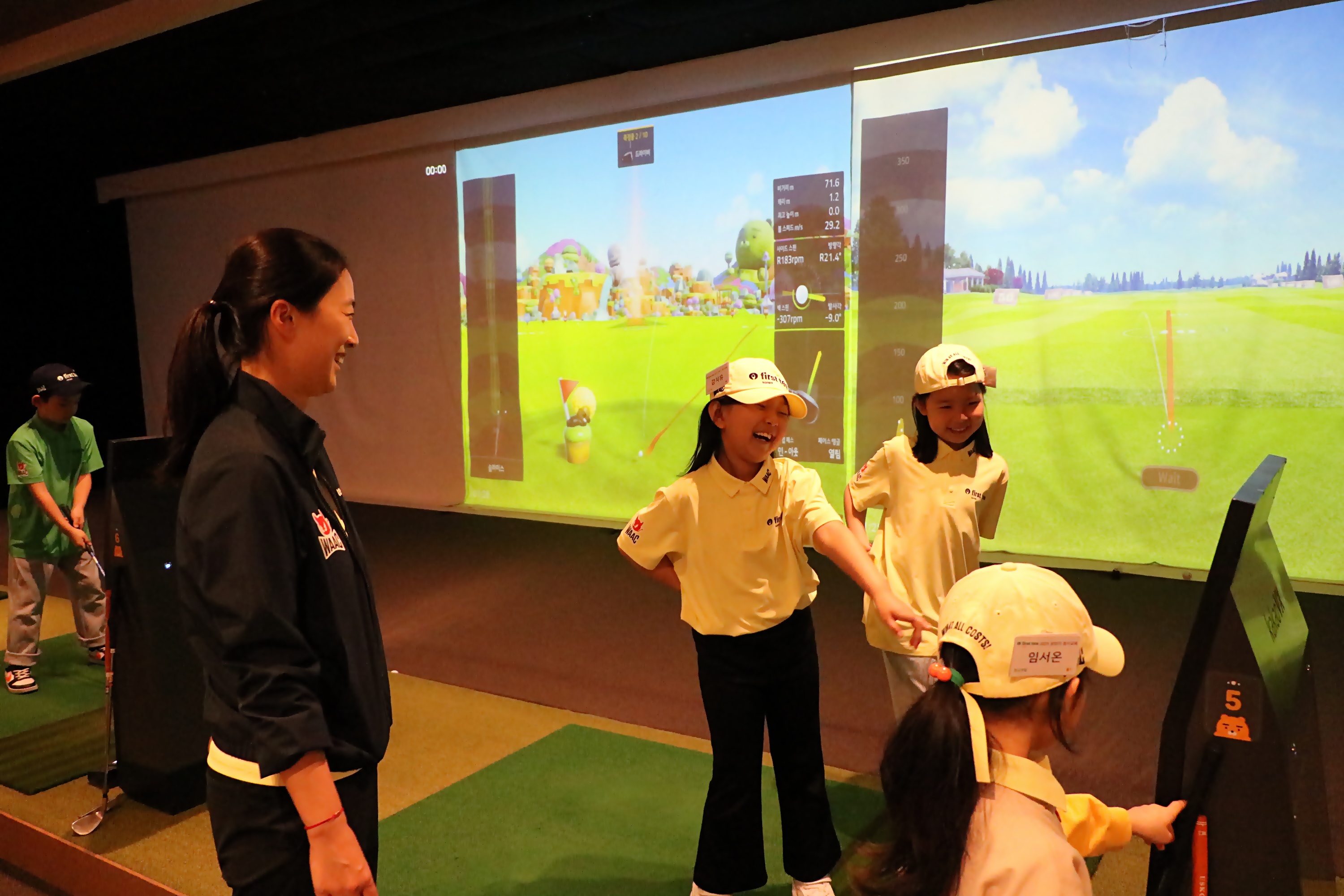 자신이 스윙한 동영상을 보면서 즐거워 하고 있는 아이들