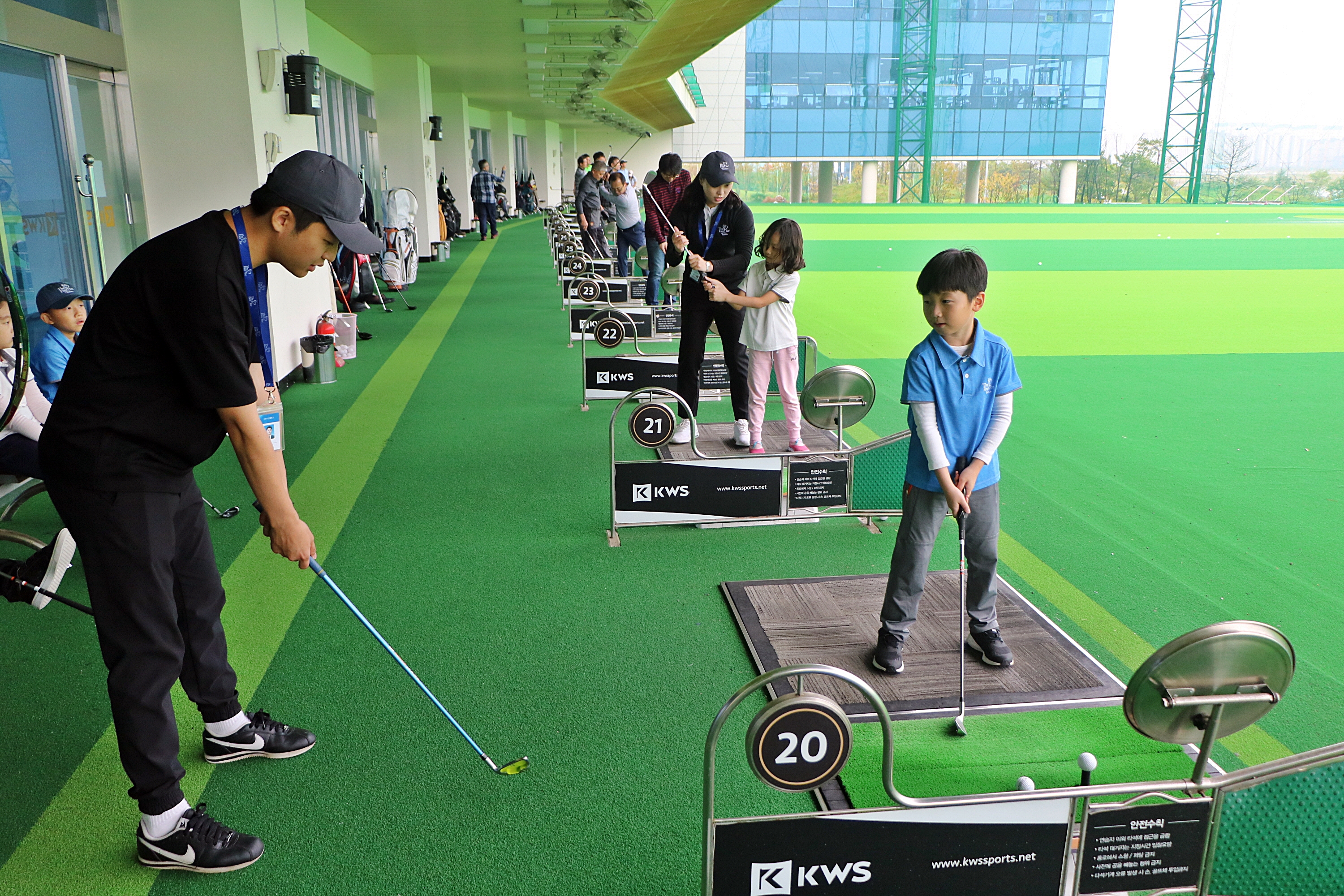스내그골프클럽이 아닌 실제 클럽을 처음 잡아본 교육생들을 위해 다시 한번 어드레스 자세에 대해 설명해 주고 있는 코치