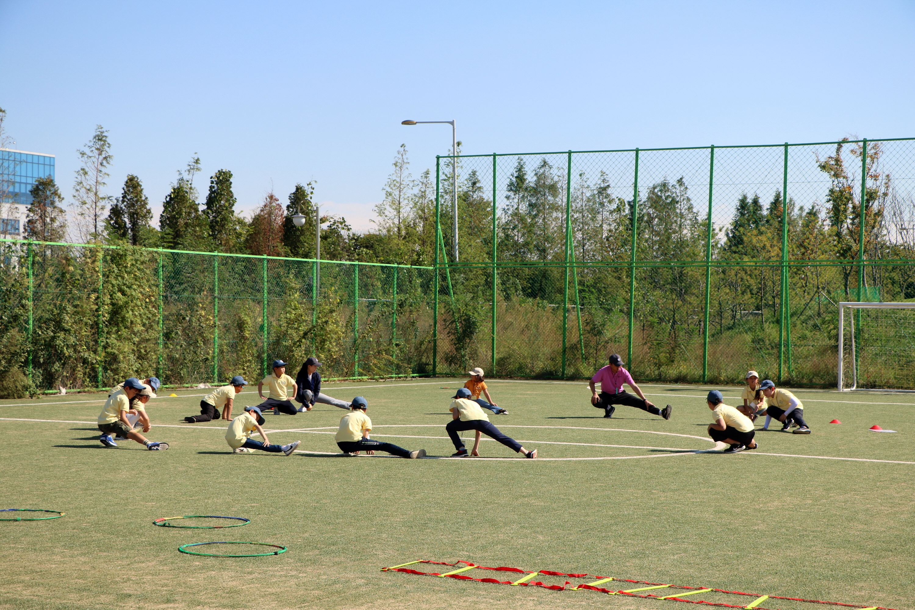 코치님과 함께 스트레칭을 하면서 몸을 풀고 있는 아이들
