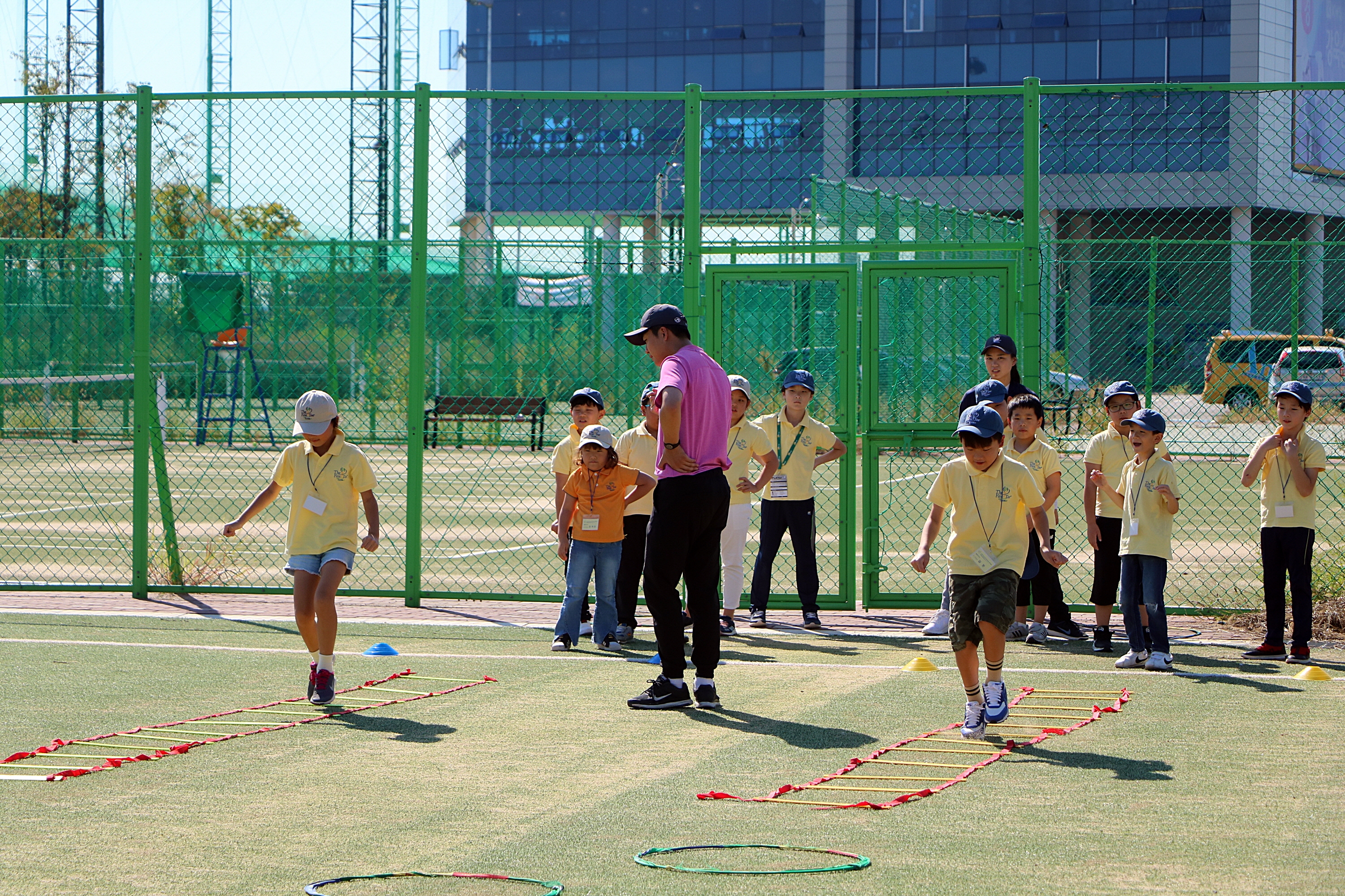 사다리 뛰기를 하면서 다리 근력강화운동을 하고 있는 아이들