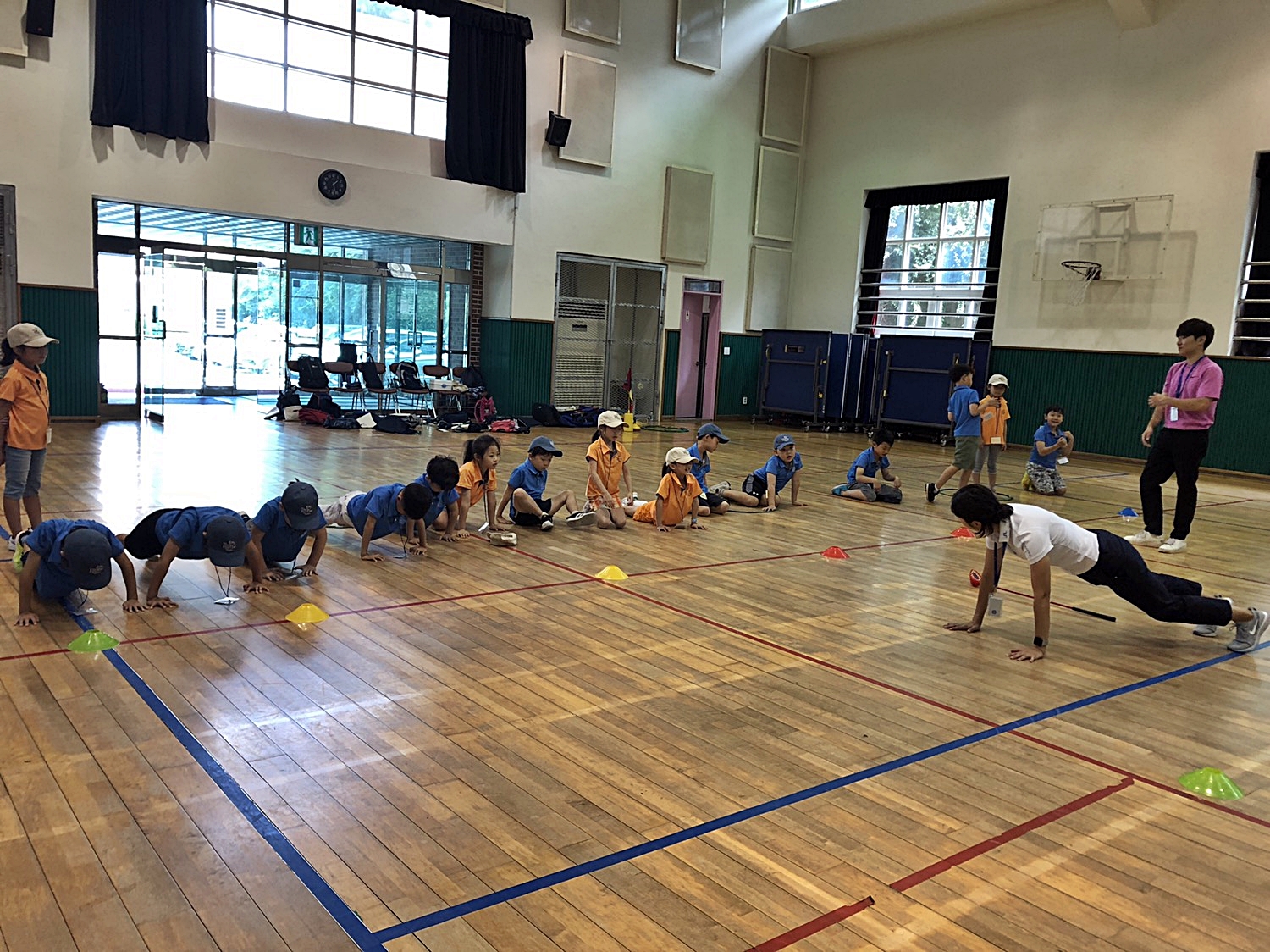 팔근력 강화를 위해 코치님을 따라 팔굽혀 펴기를 하고 있는 아이들
