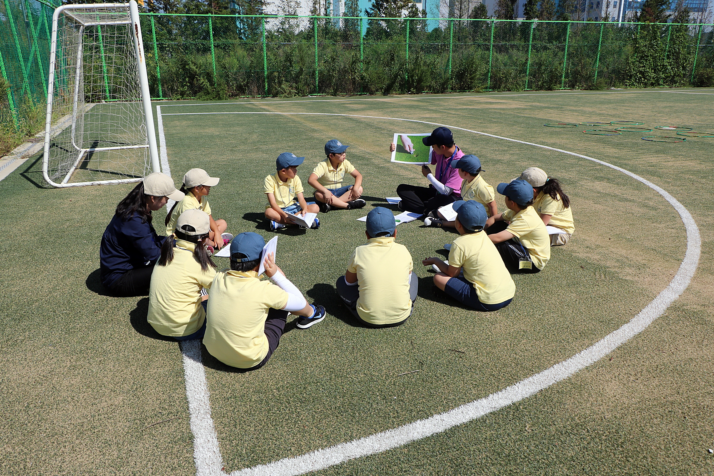 플레이 도중 그린 위에 생긴 디보트는 반드시 본인이 수리해야 함을 가르쳐 주고 있는 코치