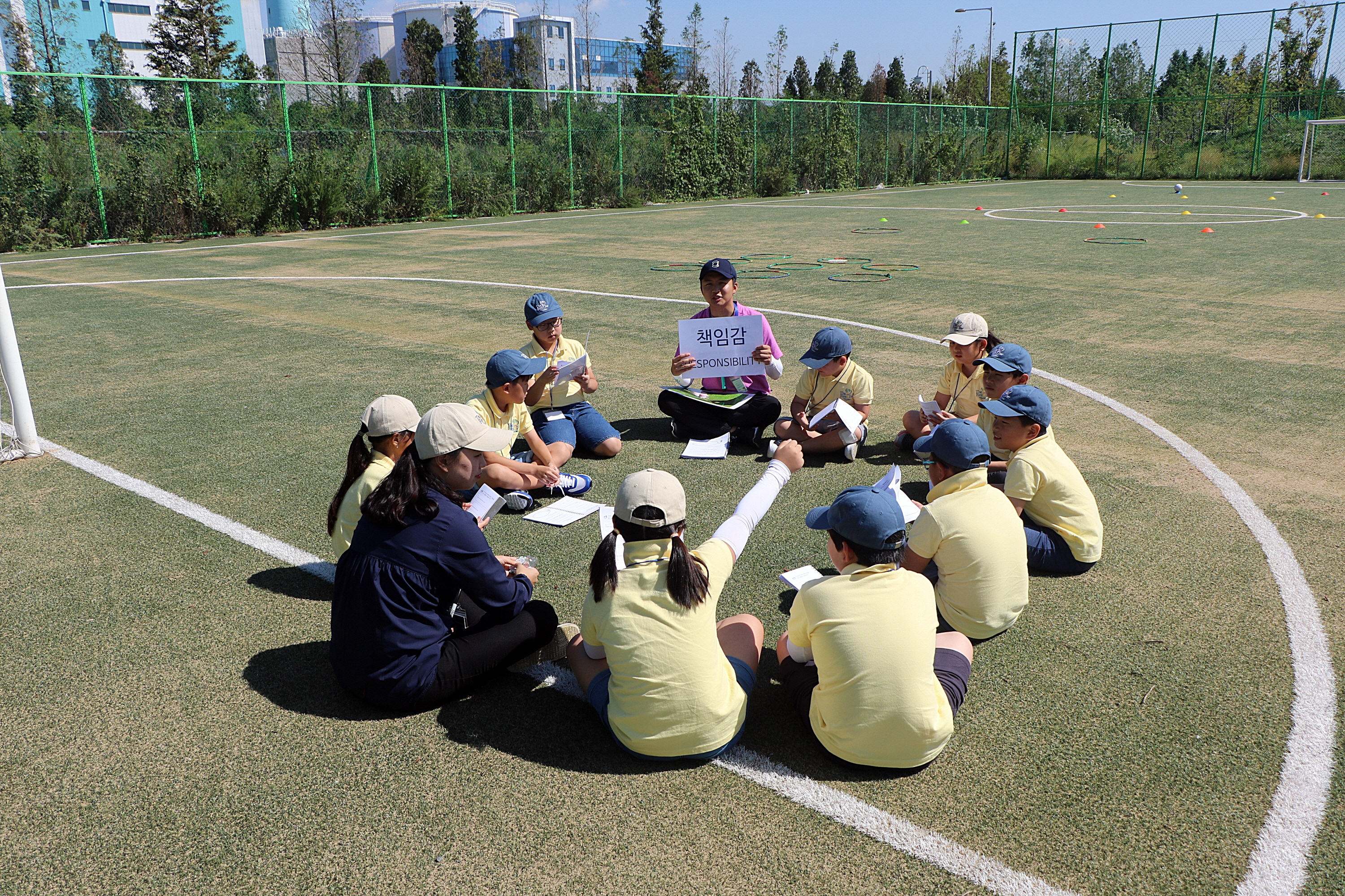 오늘의 주제인 책임감에 대한 설명을 들으며 코치님과 토론하고 있는 아이들