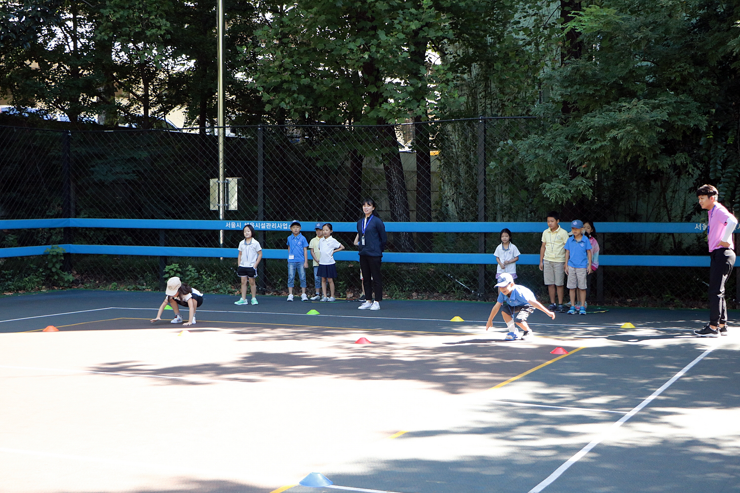 최대한 높이 뛰어오르기 위해 자세를 취하고 있는 아이들
