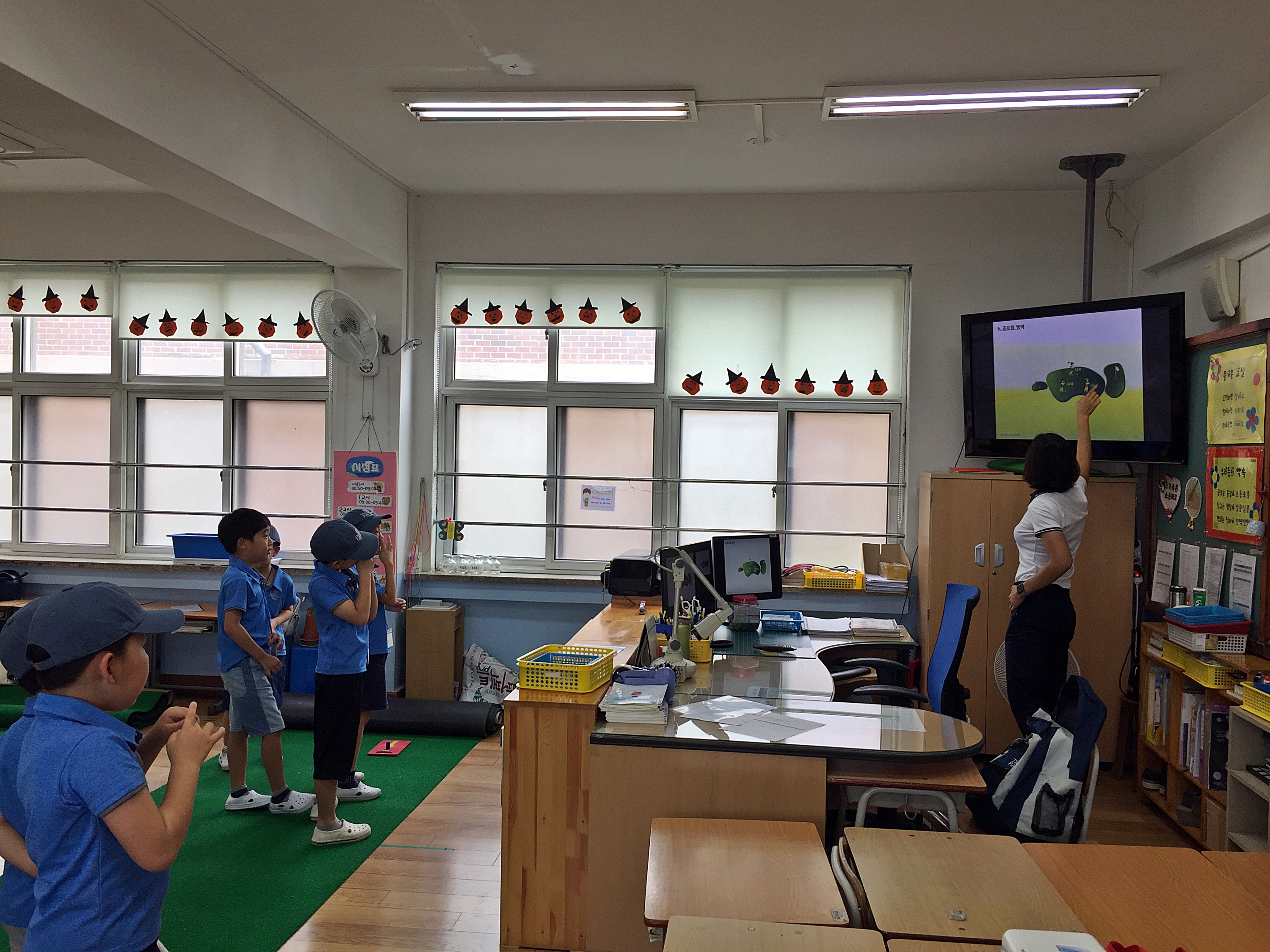 골프라운드 도중 가장 기본이 되는 원구선타에 대해 설명을 듣고 있는 아이들