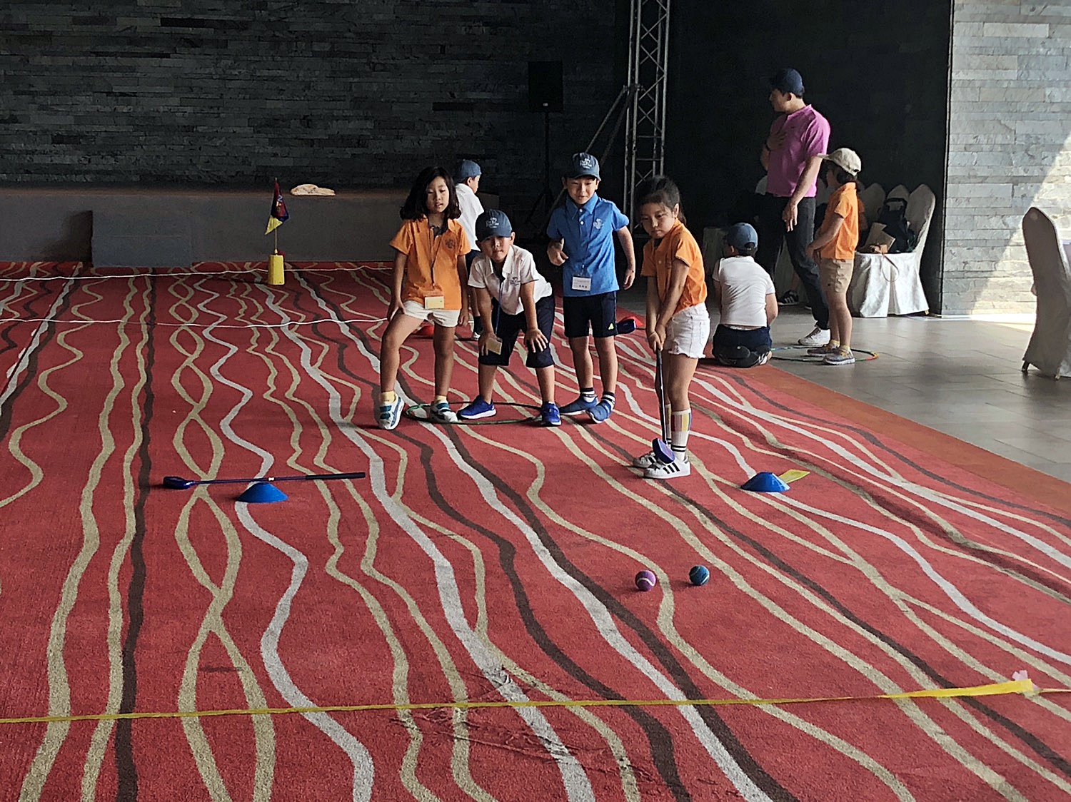 신중하게 퍼트를 하면서 방금 배운 퍼팅기술의 실전연습을 하고 있는 아이들