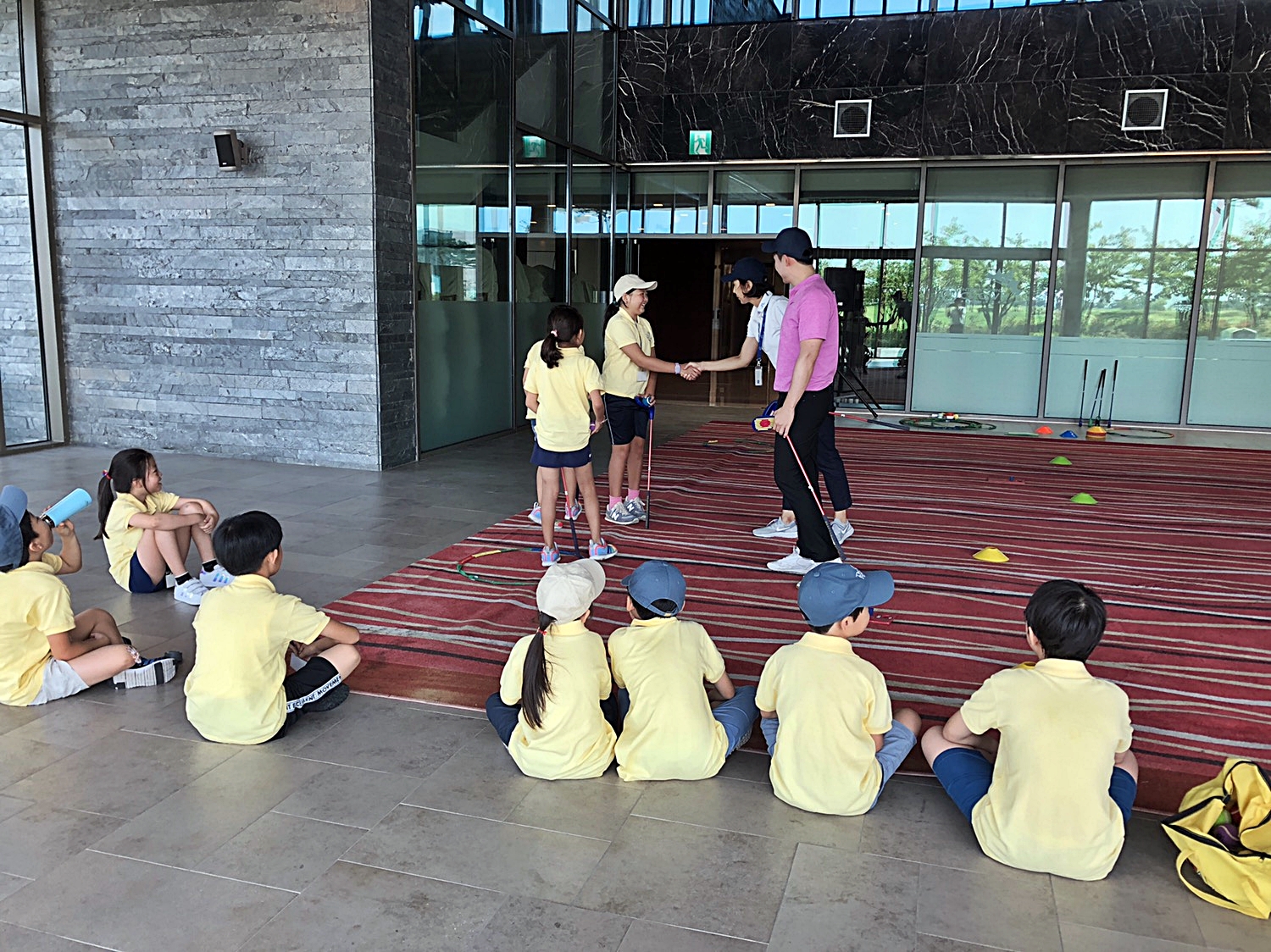 코치님과 함께 골프코스에서 상대방에 대한 예의를 표하는 것을 실습 중인 아이들