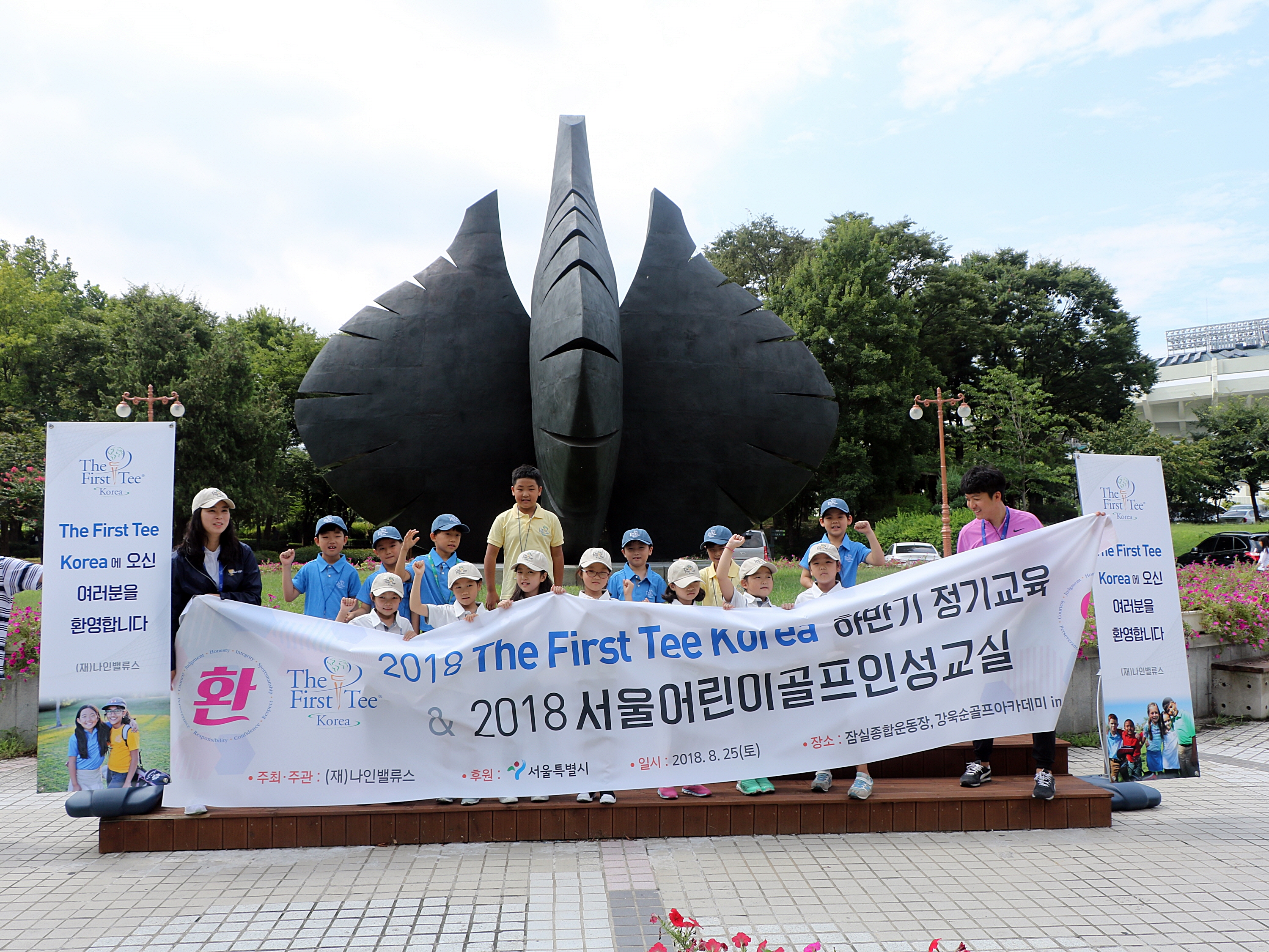 화이팅을 외치며 힘차게 골프교육의 첫발을 내딛는 아이들