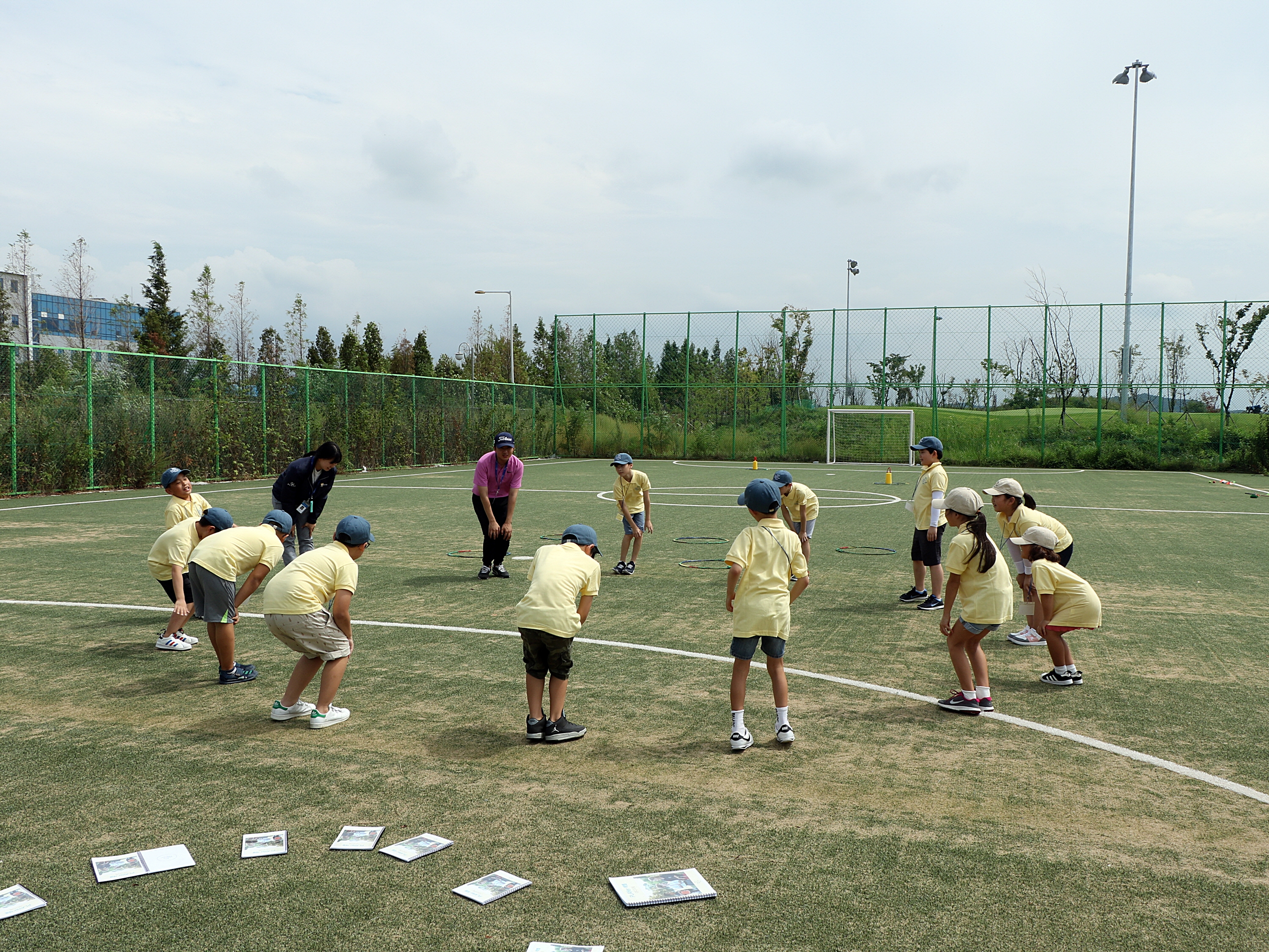 교육 도중 혹시 모를 부상 방지를 위해 코치님과 함께 몸을 풀며 워밍업을 하고 있는 아이들