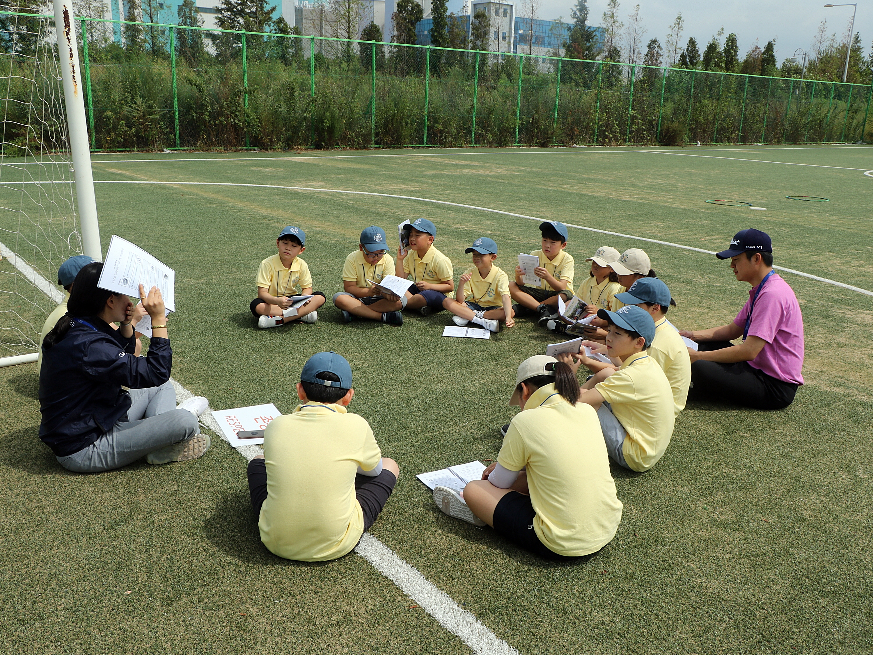 새로운 친구들과 서로 돌아가면서 자기 소개를 하고 있는 아이들