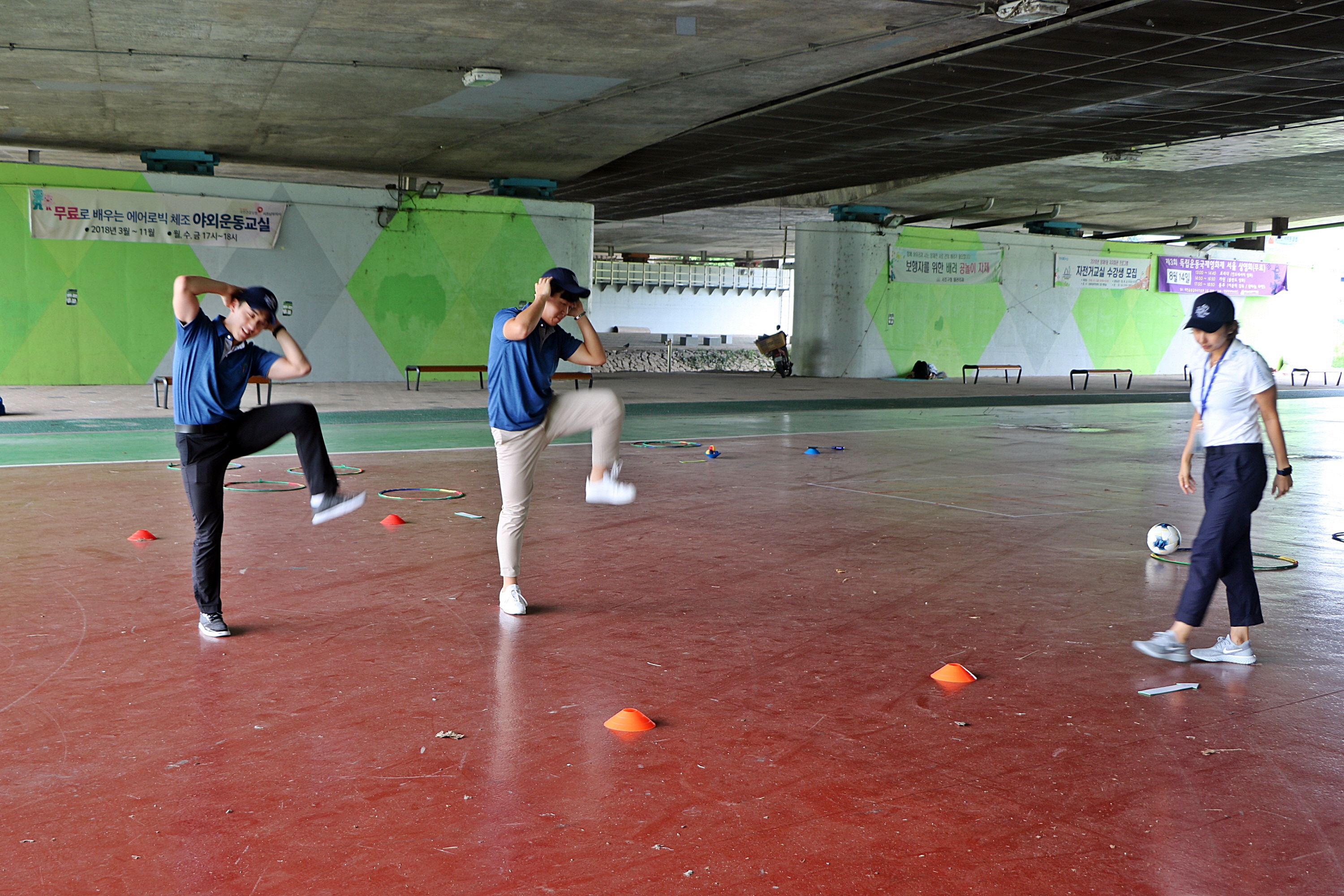 유연성 강화를 위한 동작을 실습 중인 코치들