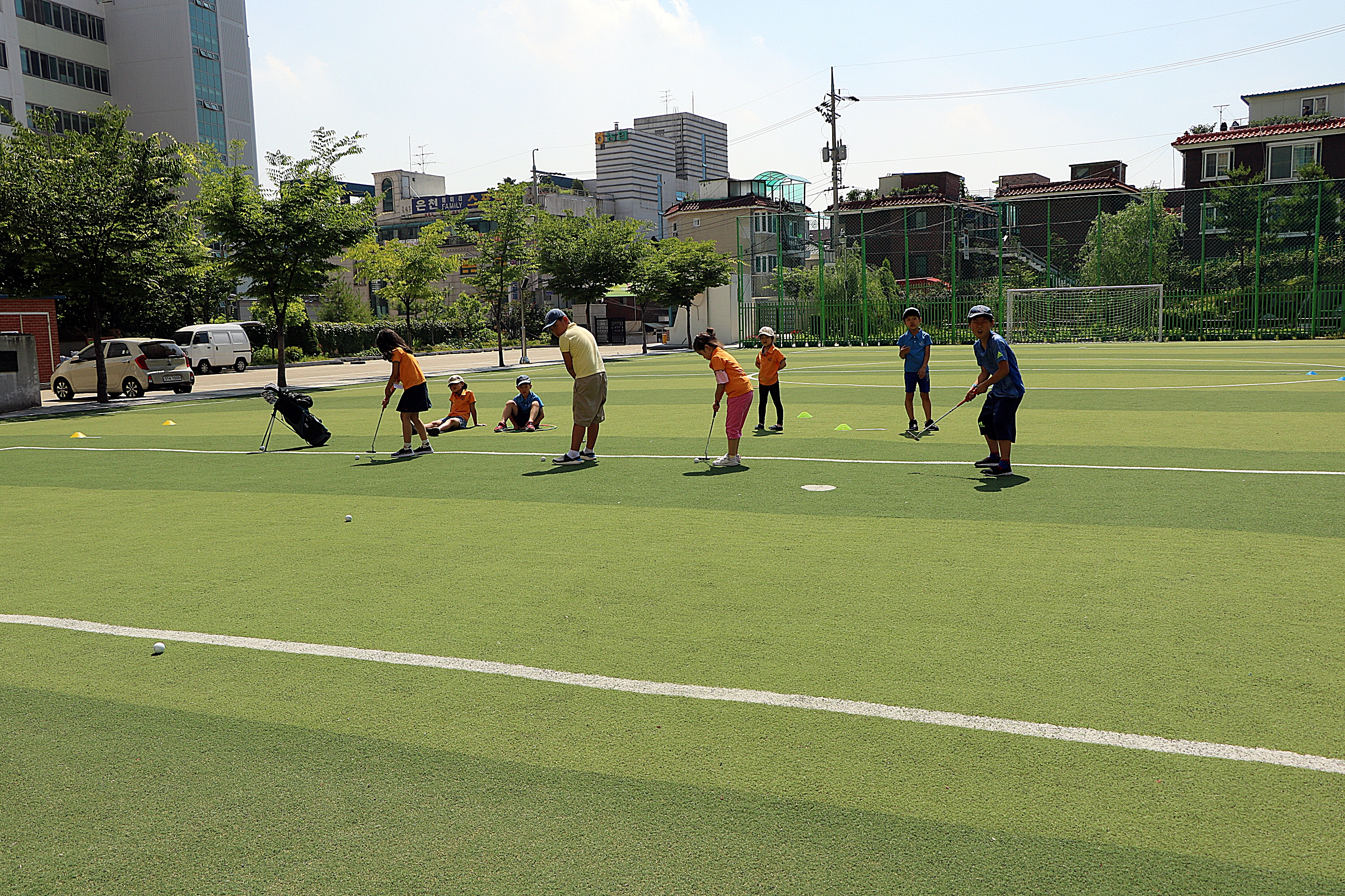 신중하게 퍼트 실습을 하고 있는 아이들