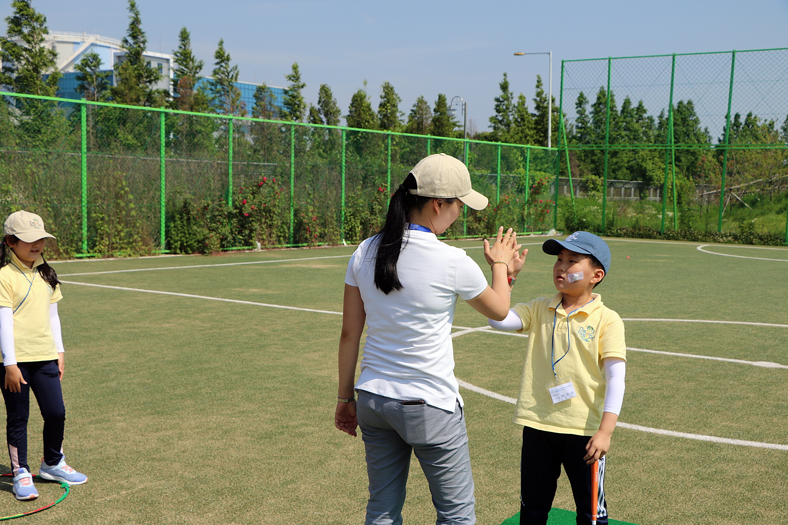 홀인에 성공한 뒤 코치님과 하이파이브를 하는 교육생