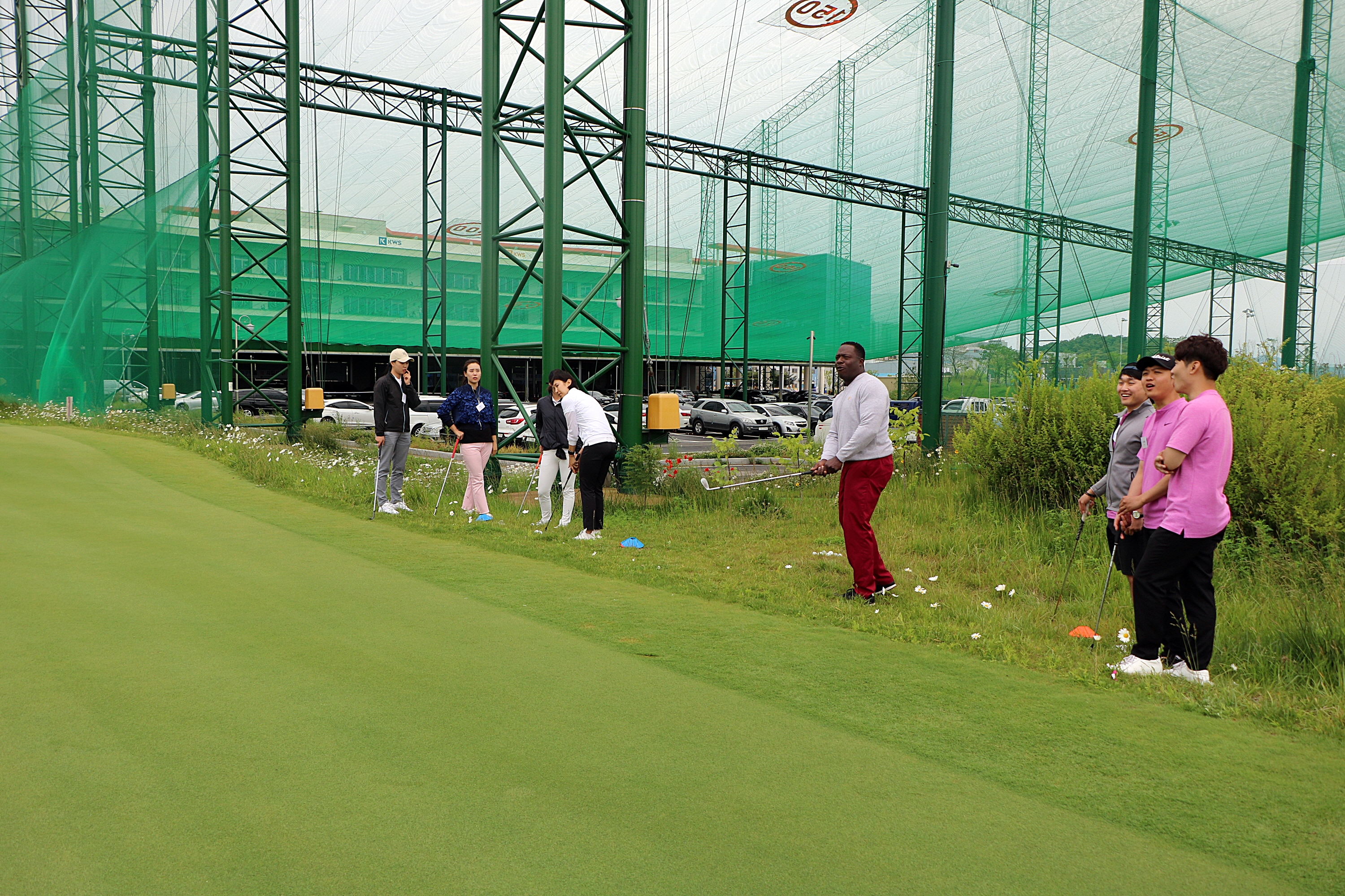 코치들에게 어프로치샷 시범을 보이고 있는 강사