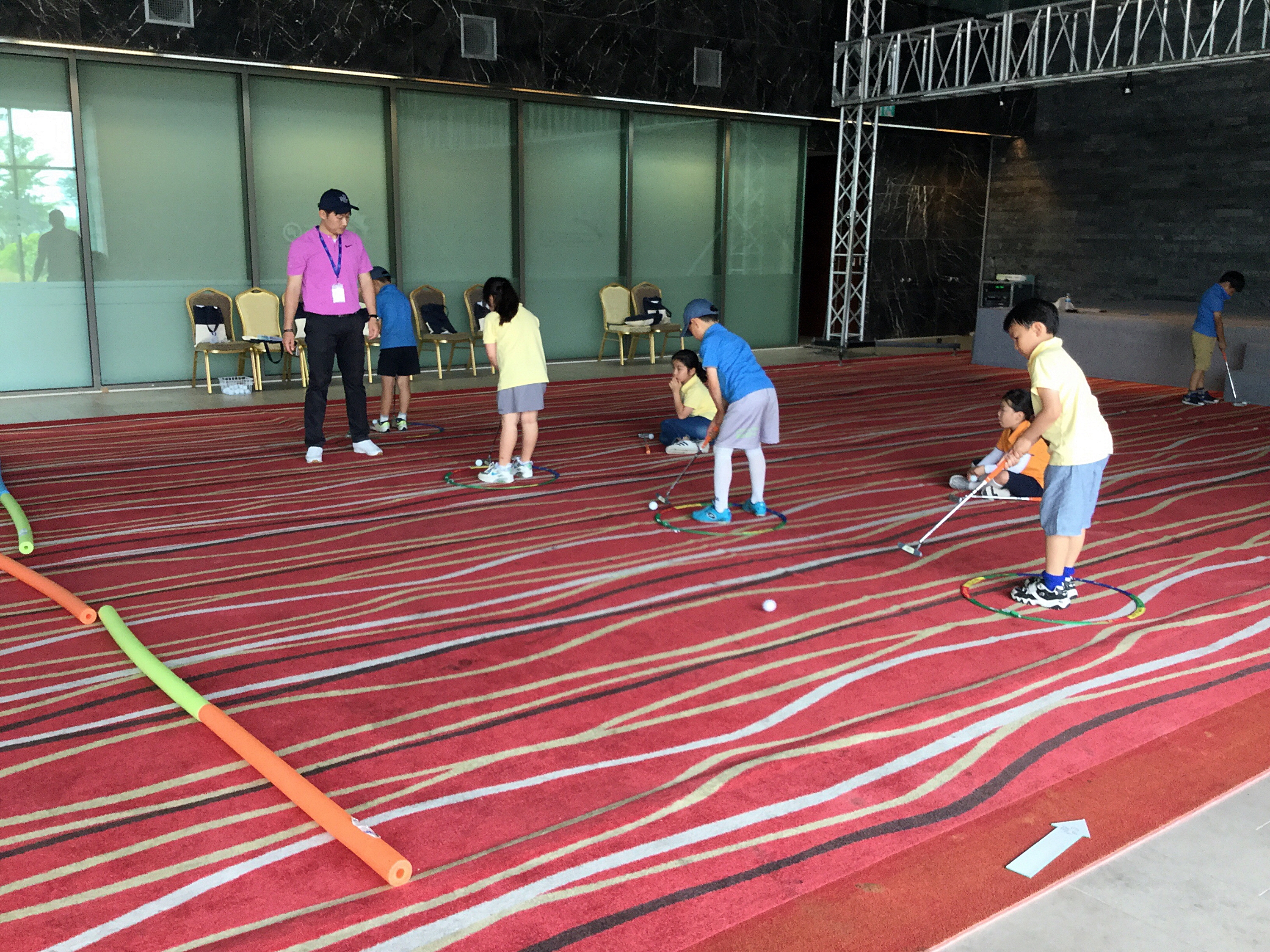 실제로 골프볼을 치는 퍼트 실습을 하고 있는 아이들