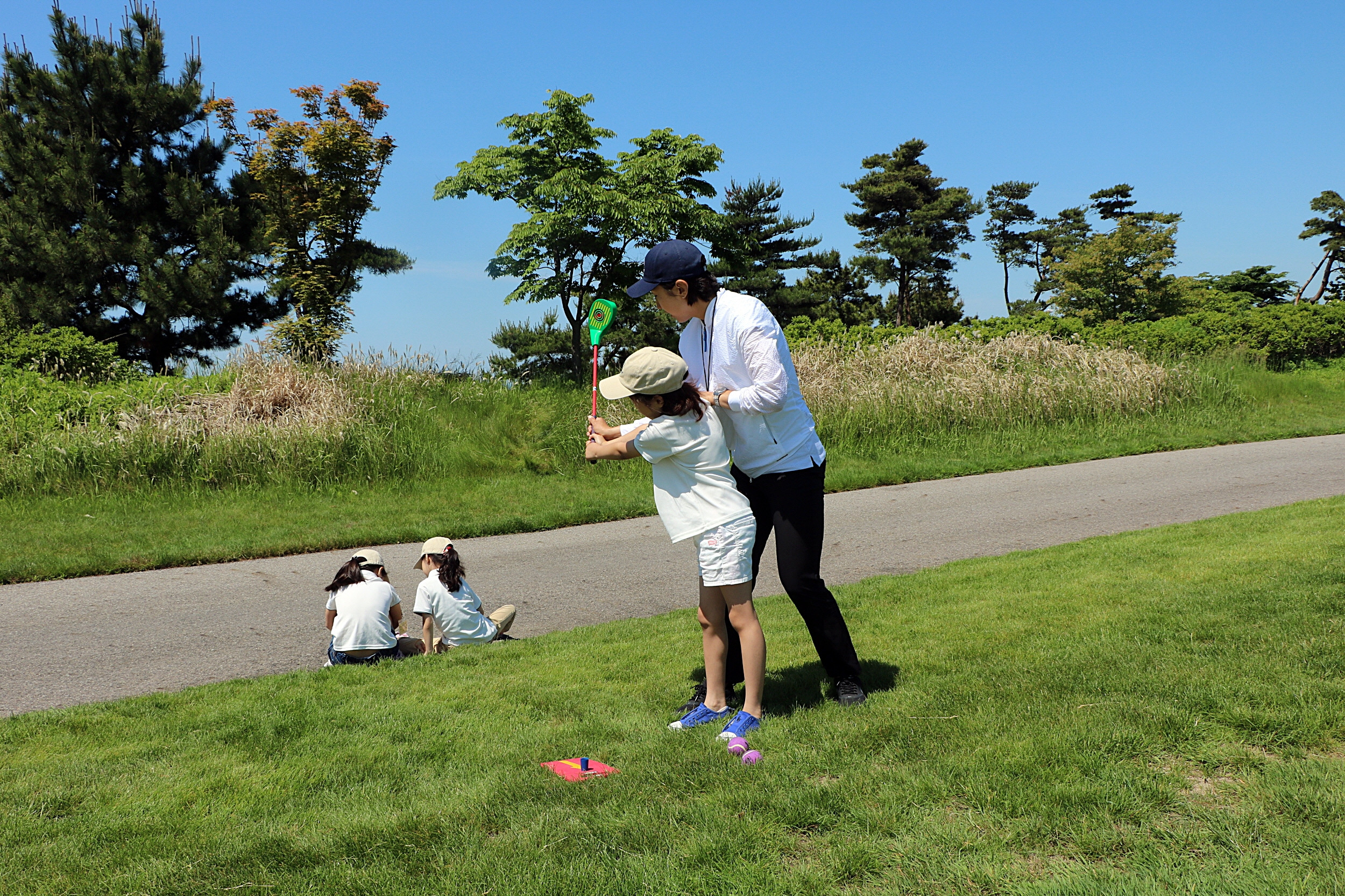 코치님께 손목 코킹에 대해 배우고 있는 교육생