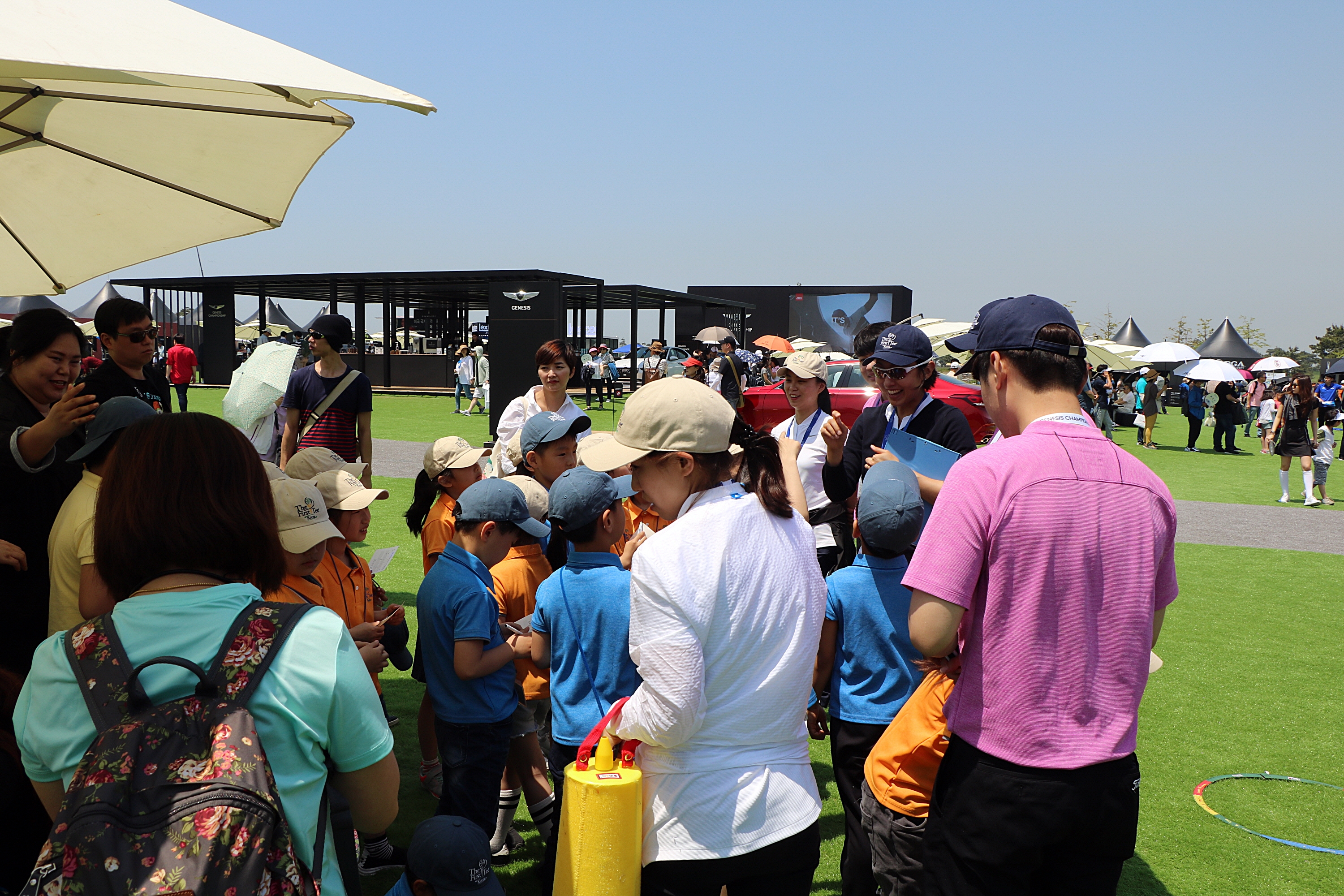 경기를 마치고 자신이 친 스코어의 합계를 계산하며 코치님 말씀을 듣고 있는 아이들