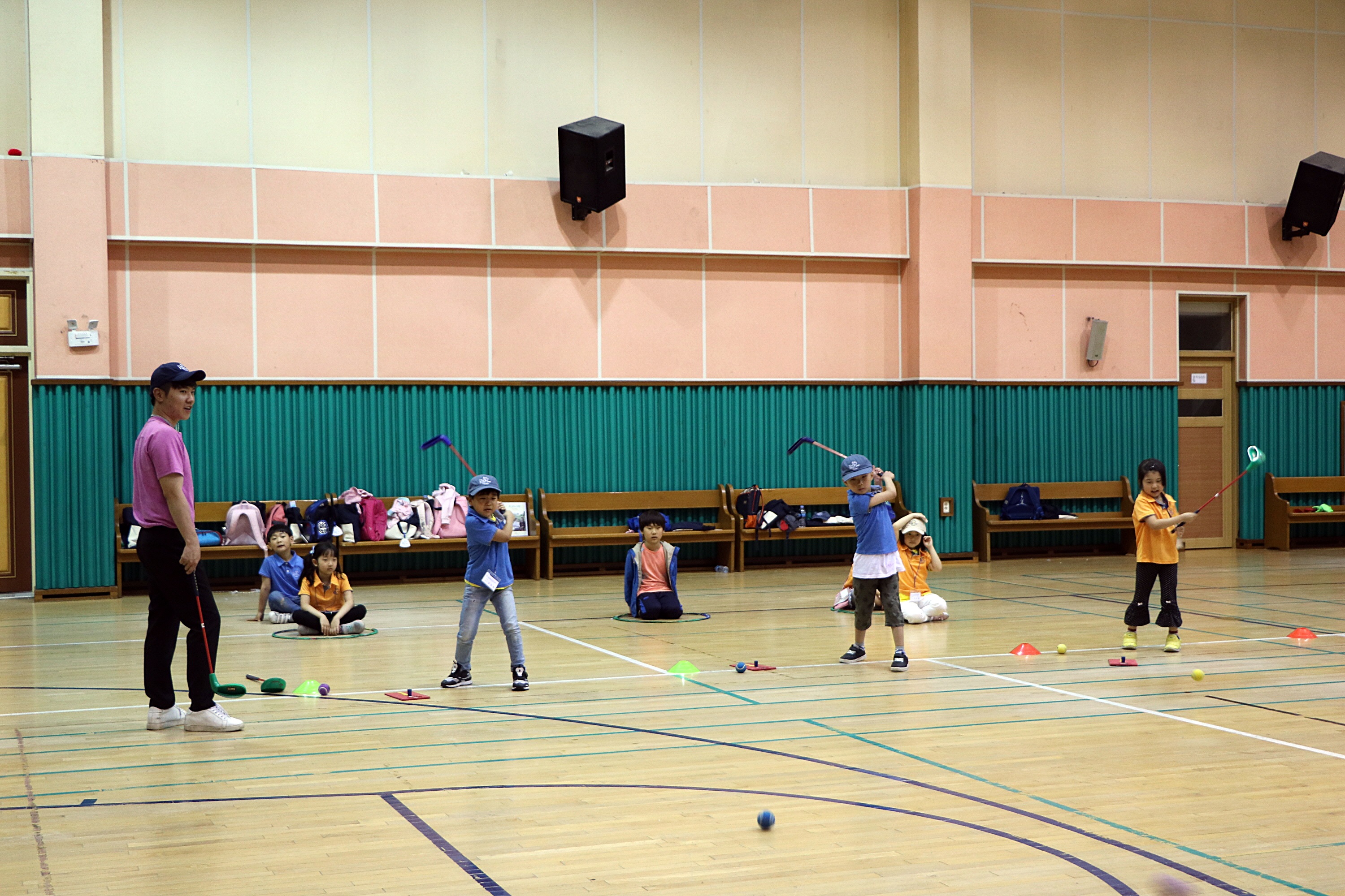 가상의 그린 위에 있는 깃대를 맞추기 위해 신중히 칩샷을 하고 있는 아이들