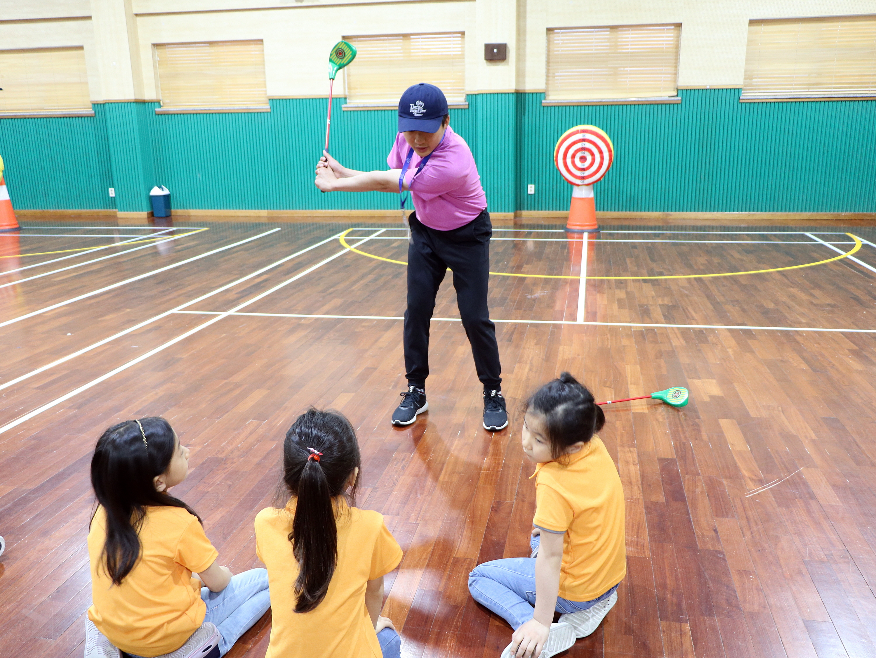 L자 스윙에 대해 설명해 주는 코치님의 말씀을 경청하는 아이들