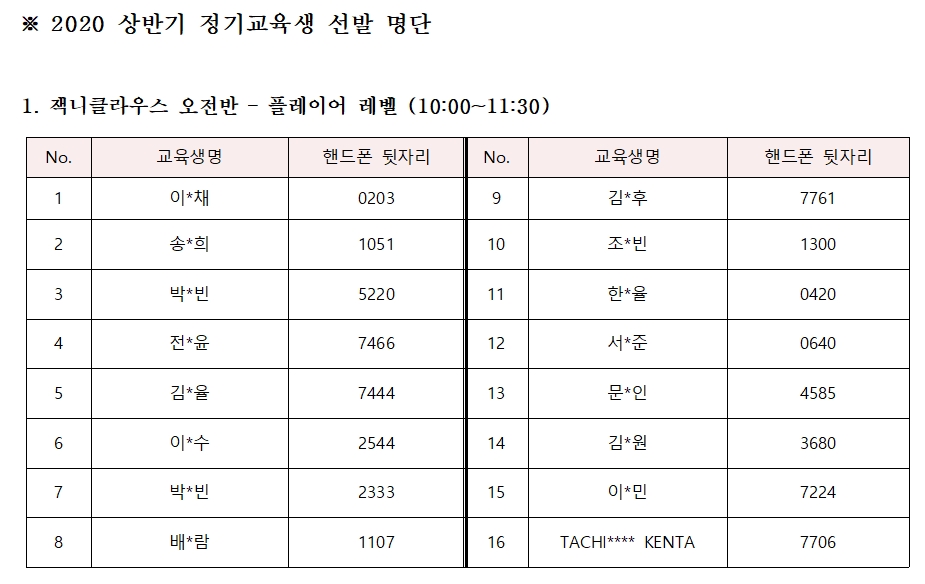 2020 더 퍼스트 티 코리아 상반기 정기교육에 많은 관심과 애정을 보내주신 학부모님과 자녀 여러분께 감사드립니다. 예정대로 이번 상반기 정기교육에 참여할 교육생 명단을 아래와 같이 공지하오니 참고하시기 바랍니다. 혹시 이번 상반기 교육에 아쉽게 탈락된 분들도 그냥 포기하지 마시고, 하반기 정기교육에 다시 신청하셔서 꼭 교육 참여 기회를 한번 더 가져보시기 바랍니다.