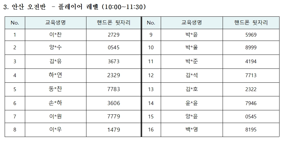 ※ 당초 예정된 안산 오후반(파 레벨)의 신청자가 적어 이 반을 플레이어 레벨반으로 대체하였습니다. 따라서 이번 상반기 정기교육 플레이어 레벨반에 선발되지 않은 교육생들은 안산 오후반에 추가신청이 가능하므로 많은 참여바랍니다. 상기 신규반의 추가 참가신청기간은 오는 9(월)~11(수)까지 입니다.