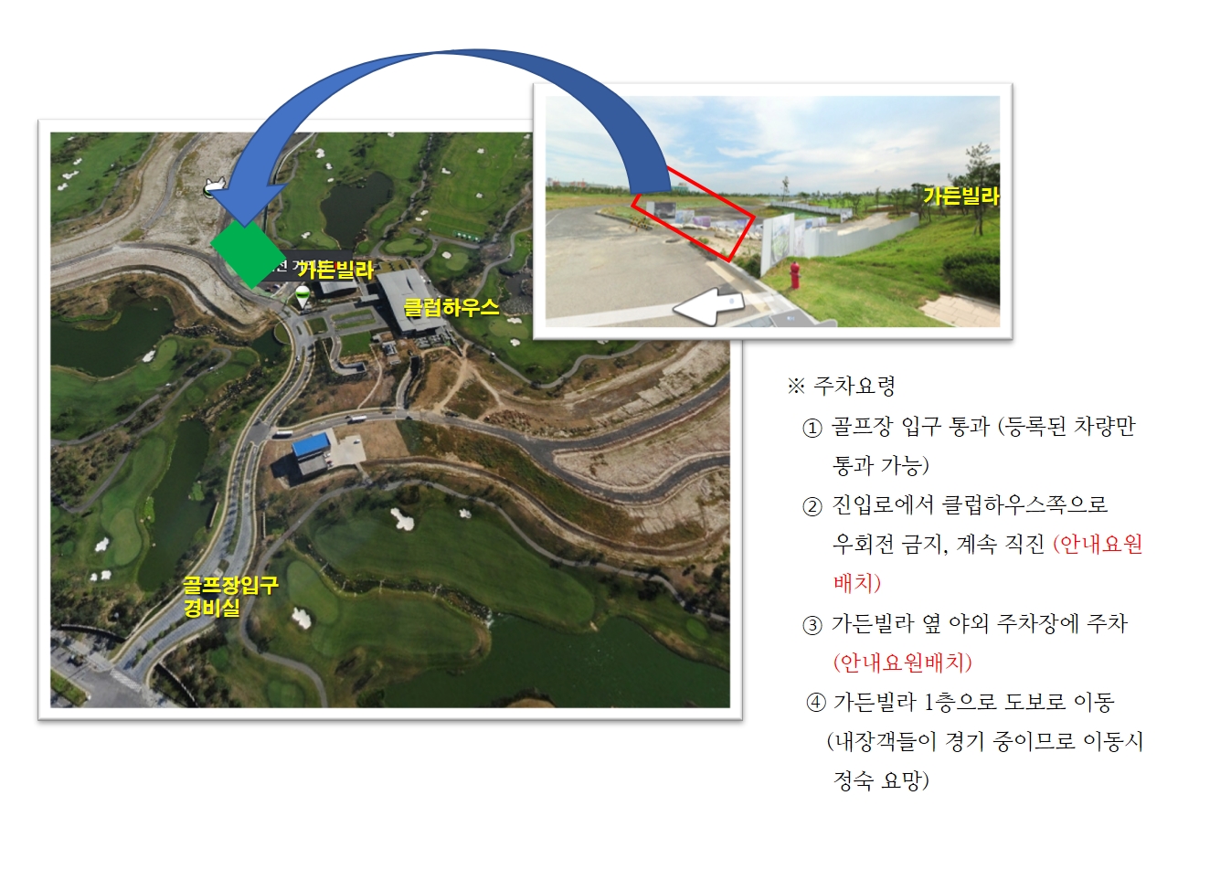 - 행사 당일 많은 인원이 동시에 참여하는 관계로 반드시 클럽하우스 주차장이 아닌 가든빌라 옆 야외 주차장에 주차해 주시기 바랍니다.