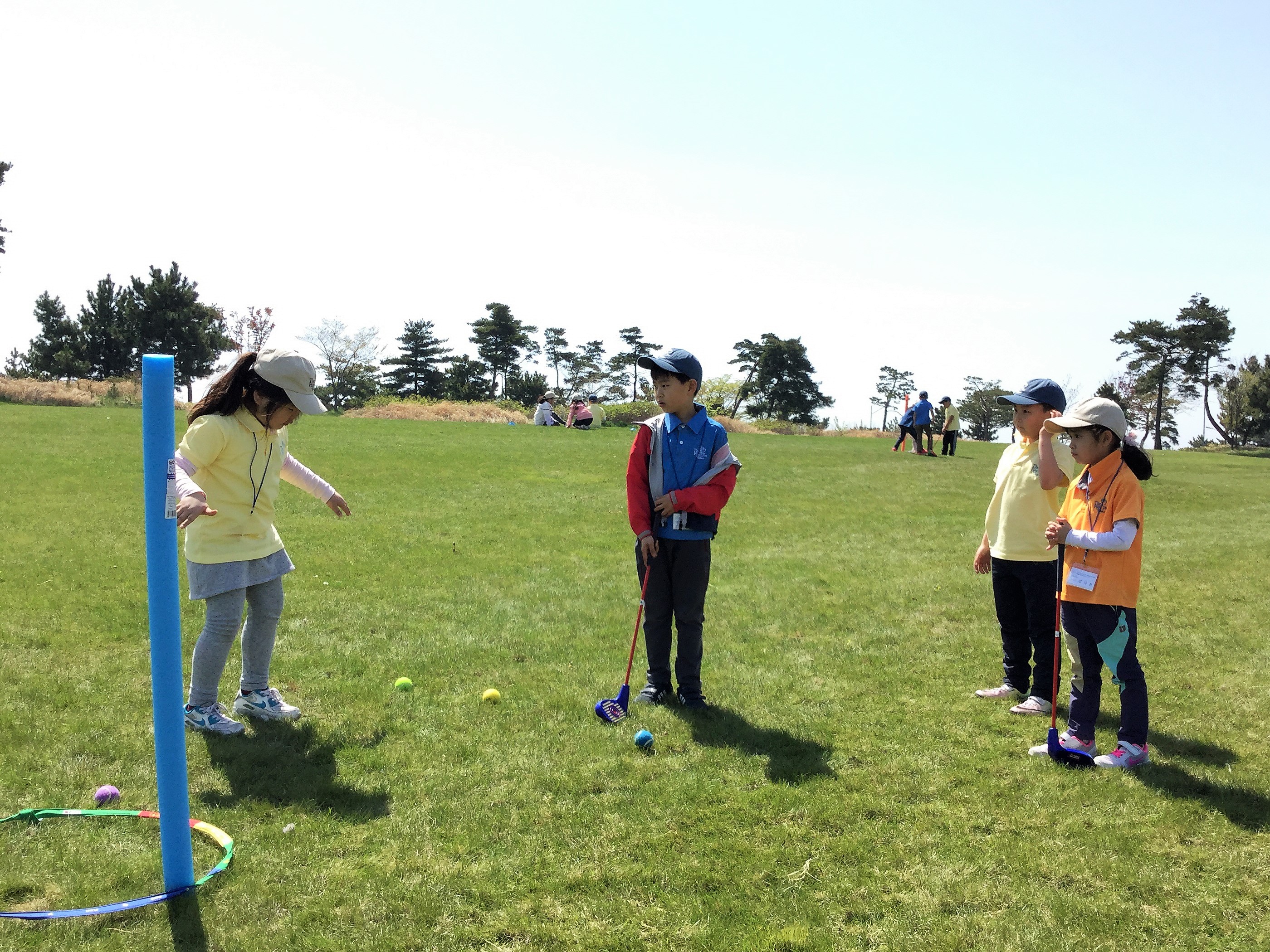 플레이 순서를 정하기 위해 누구 볼이 홀과 가까운지를 따져보고 있는 아이들