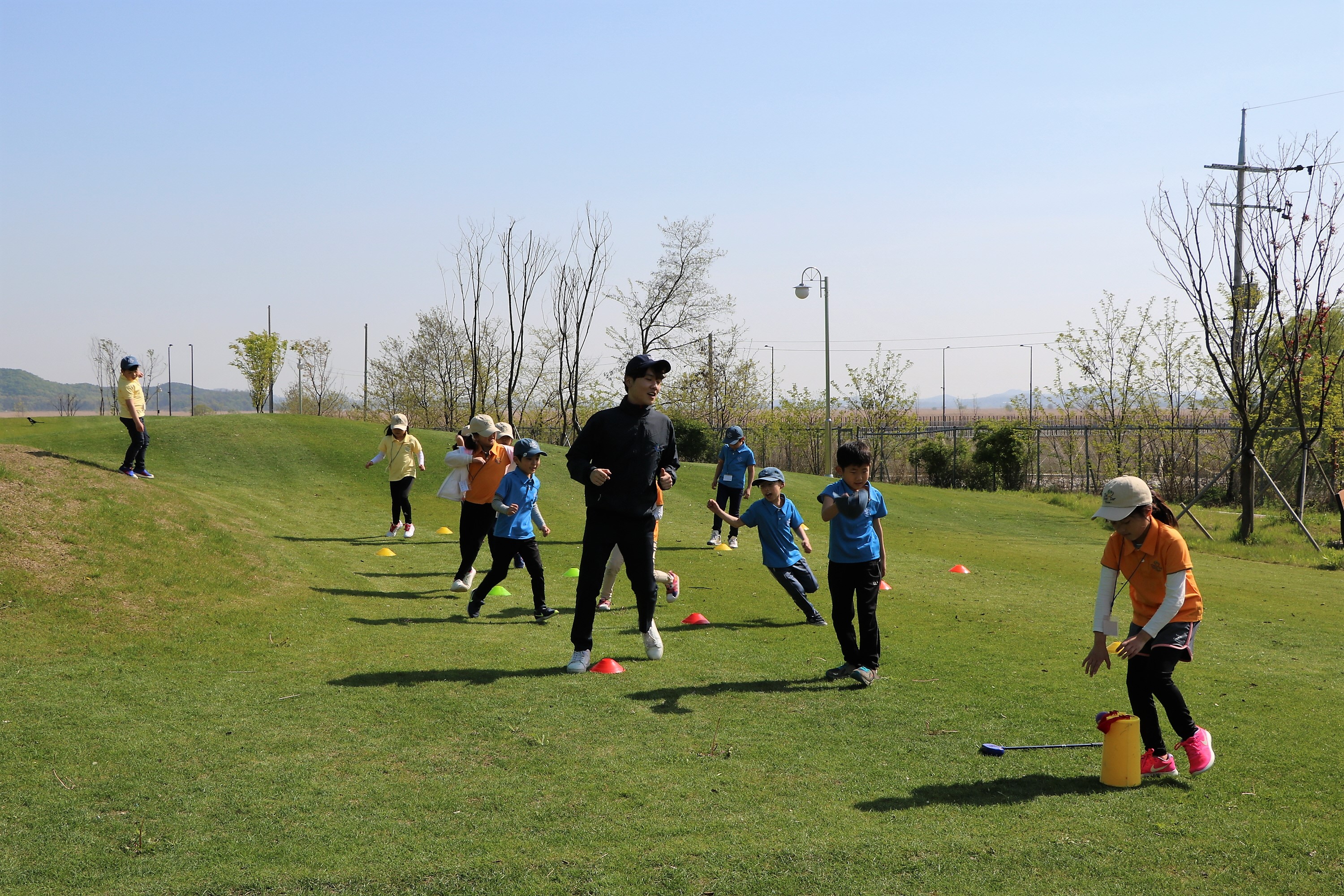 코치님과 함께 다함께 지그재그로 장애물을 통과하며 즐거워 하는 아이들