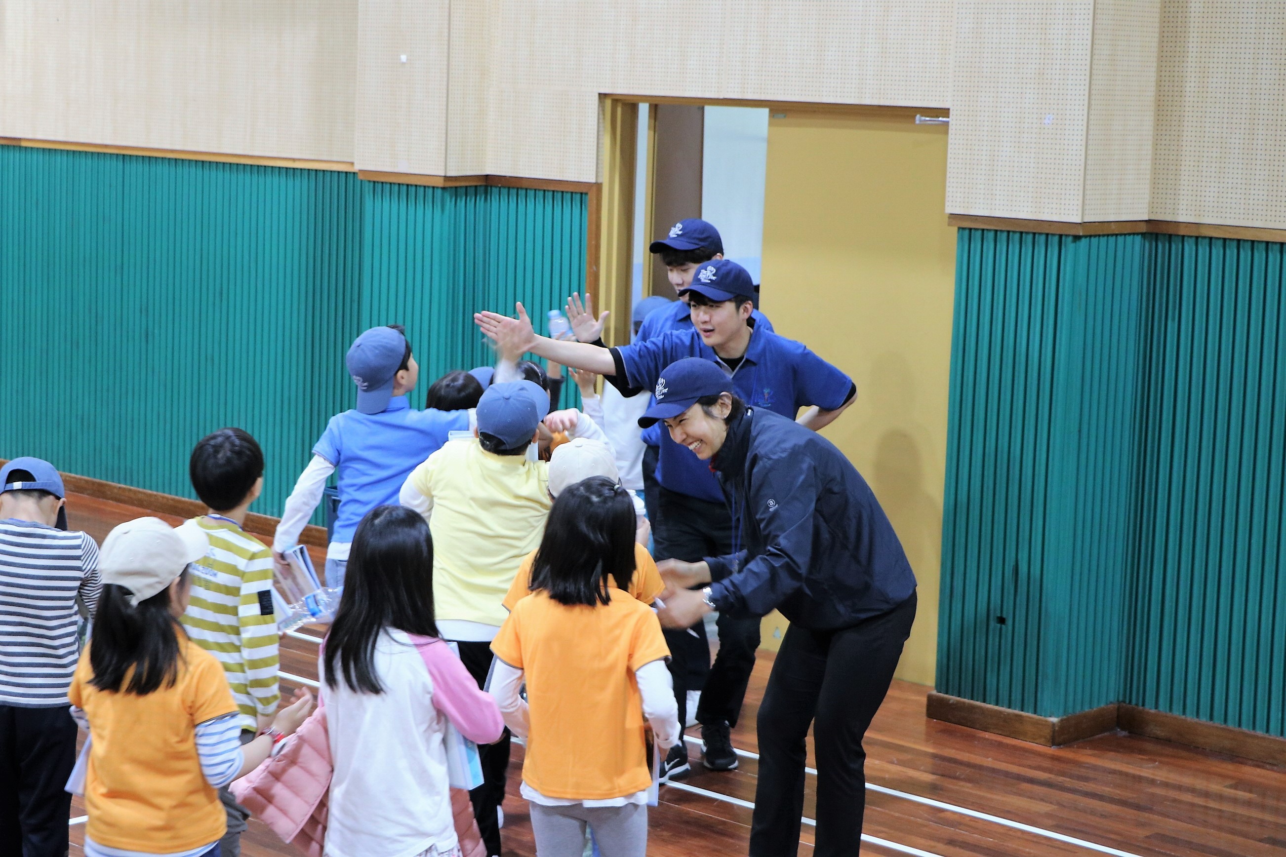 모든 교육을 마치고 코치님들과 하이파이브를 하며 작별인사를 하고 있는 아이들