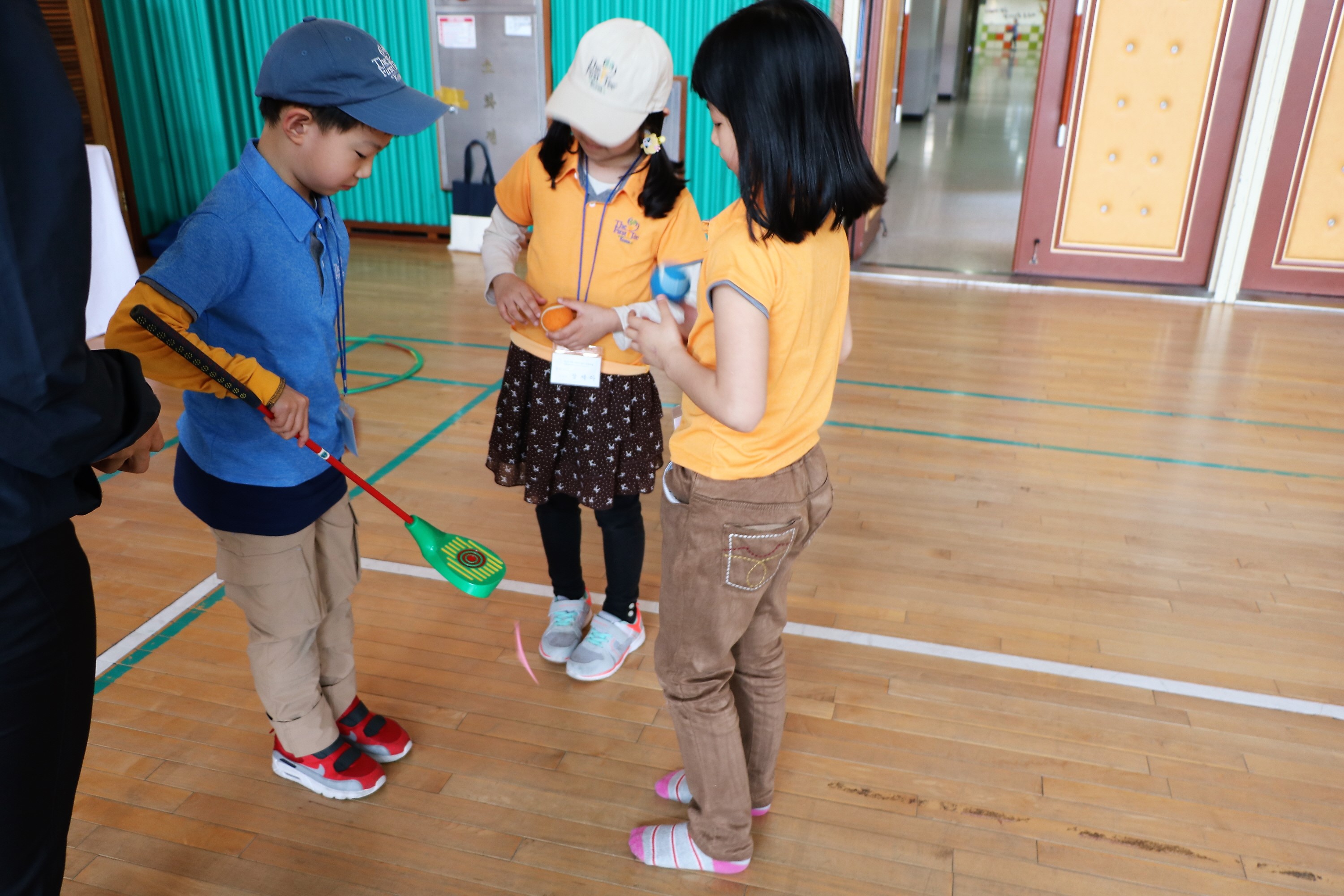 티샷하는 순서를 정하는 방법에 대해서 배운 뒤 직접 해 보는 아이들