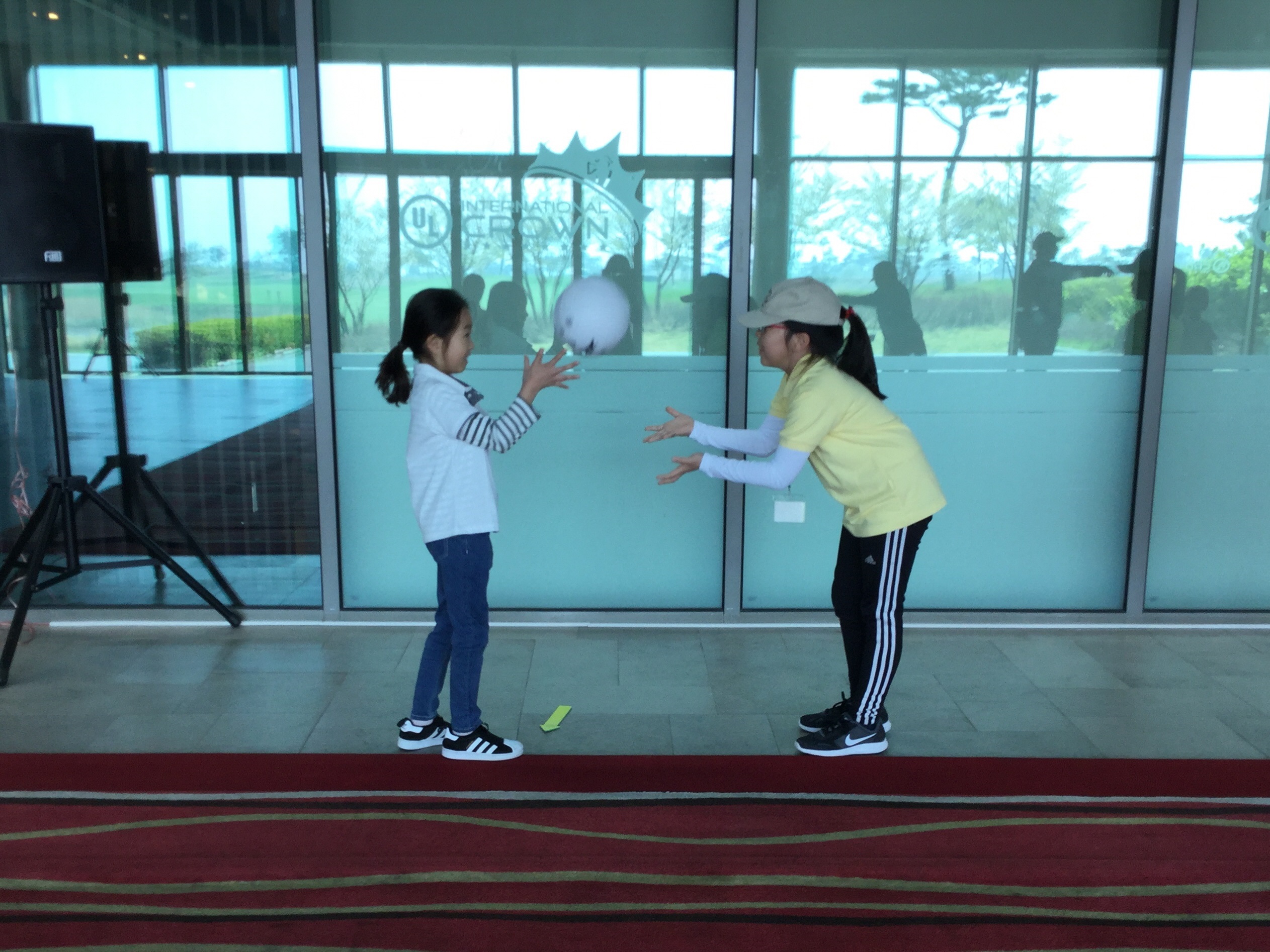 서로 공을 주고 받으며 협동심을 키우고 있는 모습