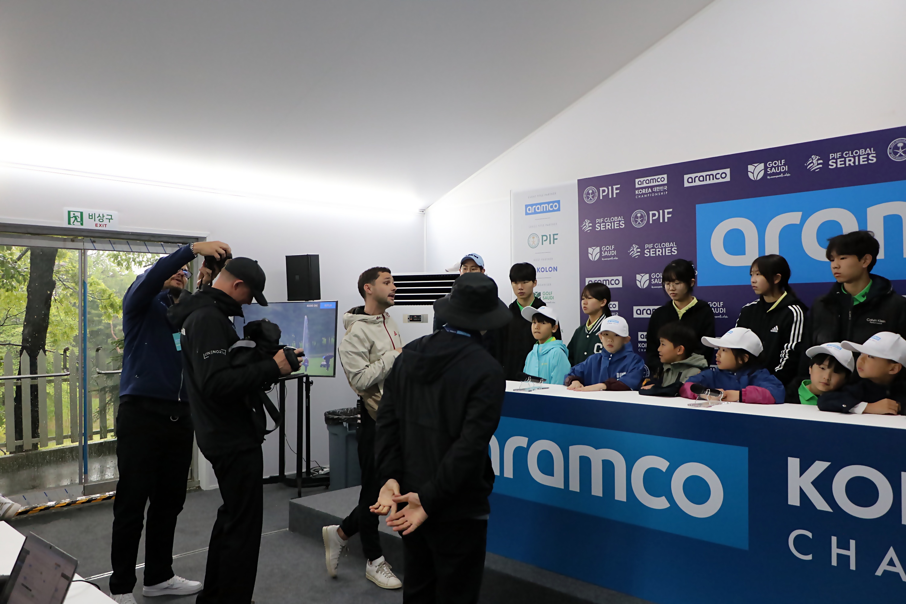 기자들의 많은 관심 속에 인터뷰석에서 다양한 체험을 하고 있는 아이들