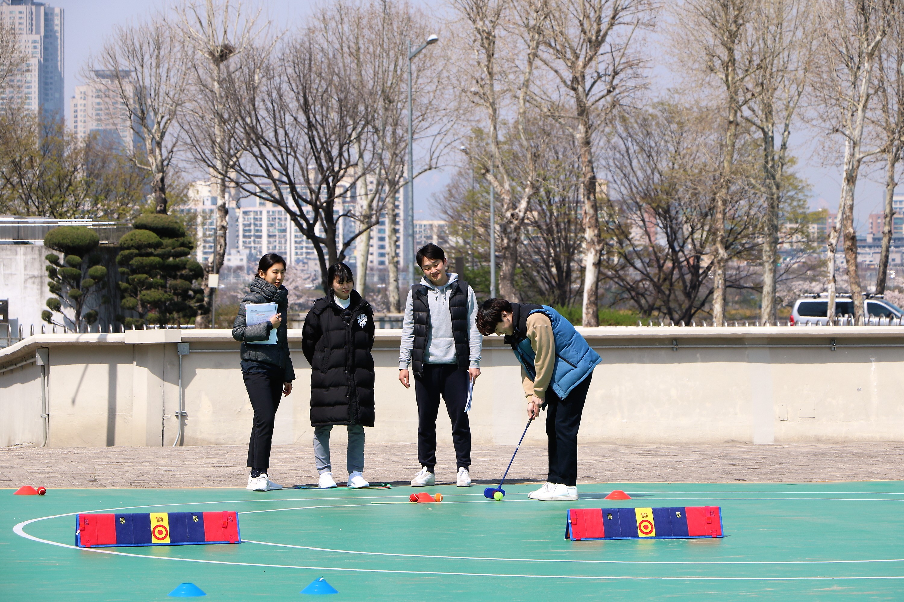 짧은 거리의 퍼트를 하는 요령에 대해 설명하는 방법을 실습 중인 코치들