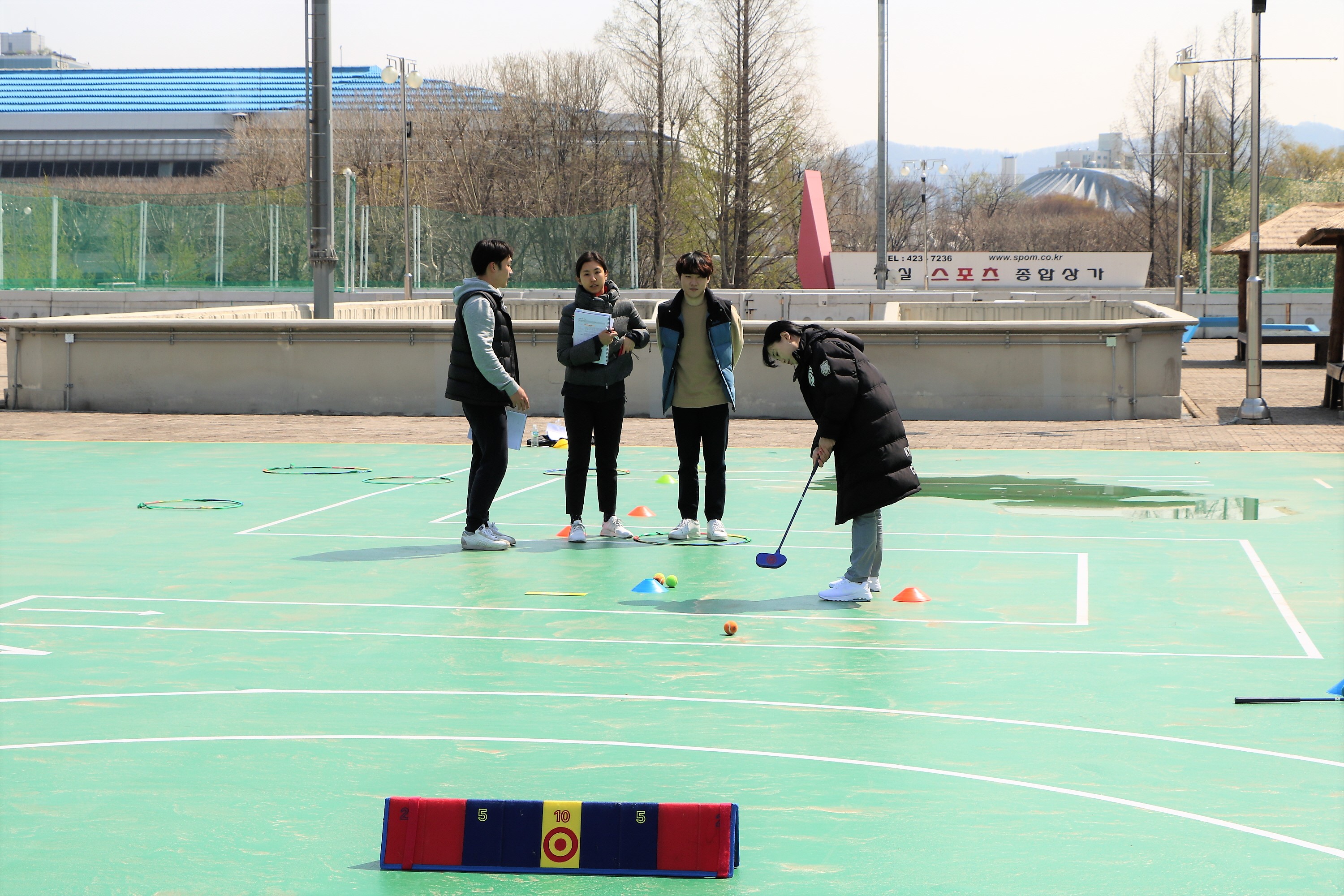 롱퍼트하는 요령에 대한 설명방법을 실습 중인 코치들