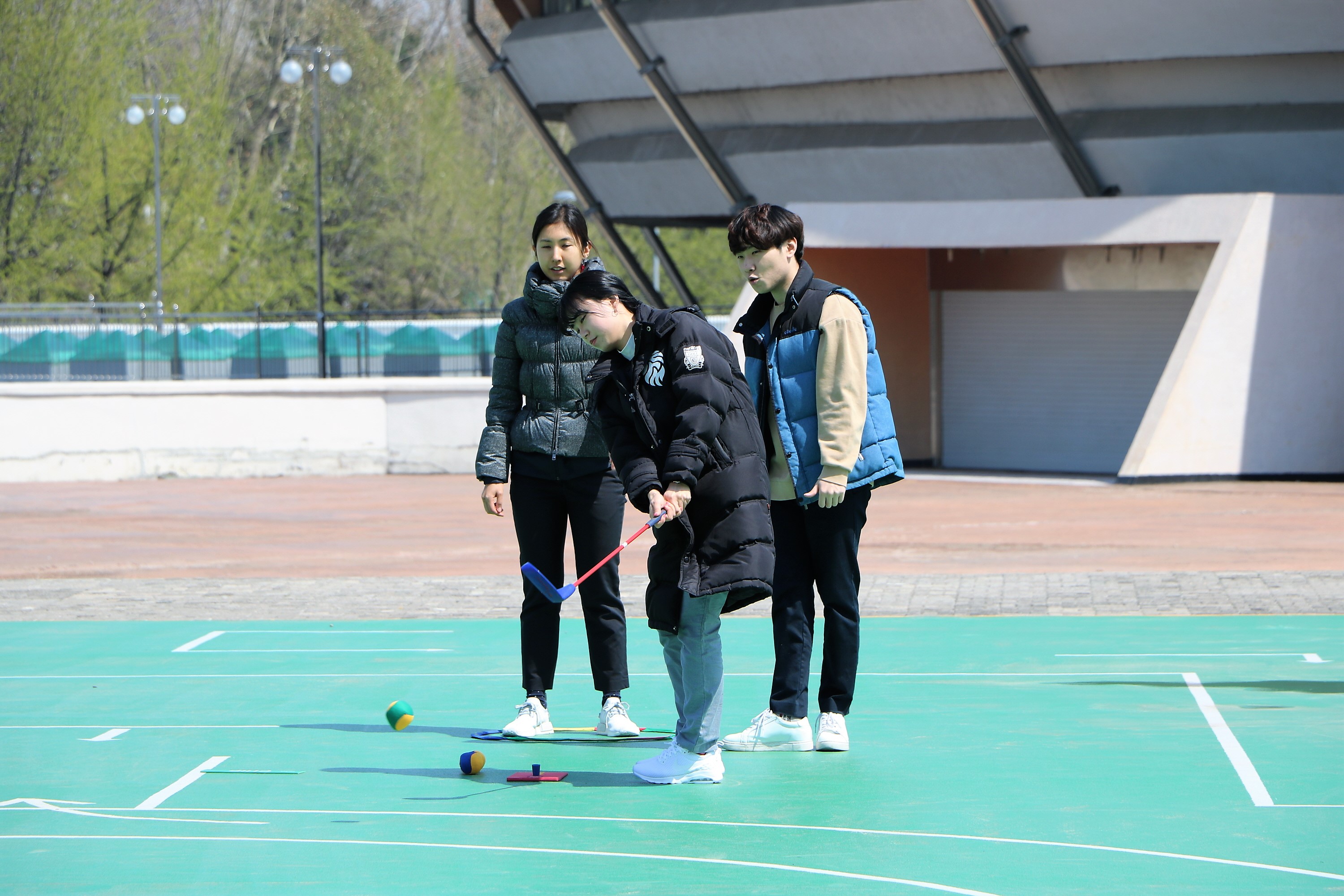 칩샷하는 요령에 대해 설명하는 방법을 실습 중인 코치들