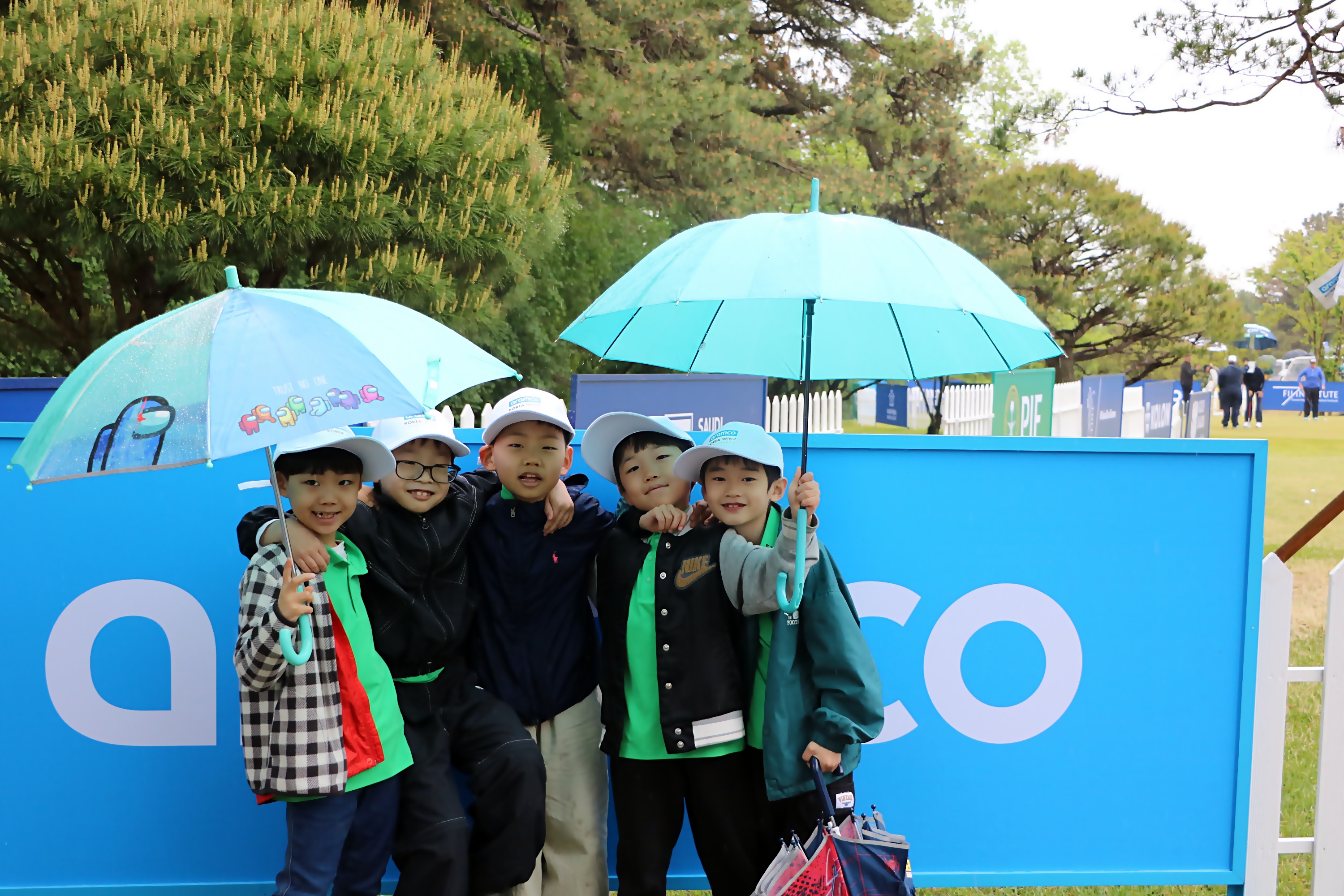 연습그린에서 선수들이 연습하는 모습을 보면서 즐거워 하는 아이들