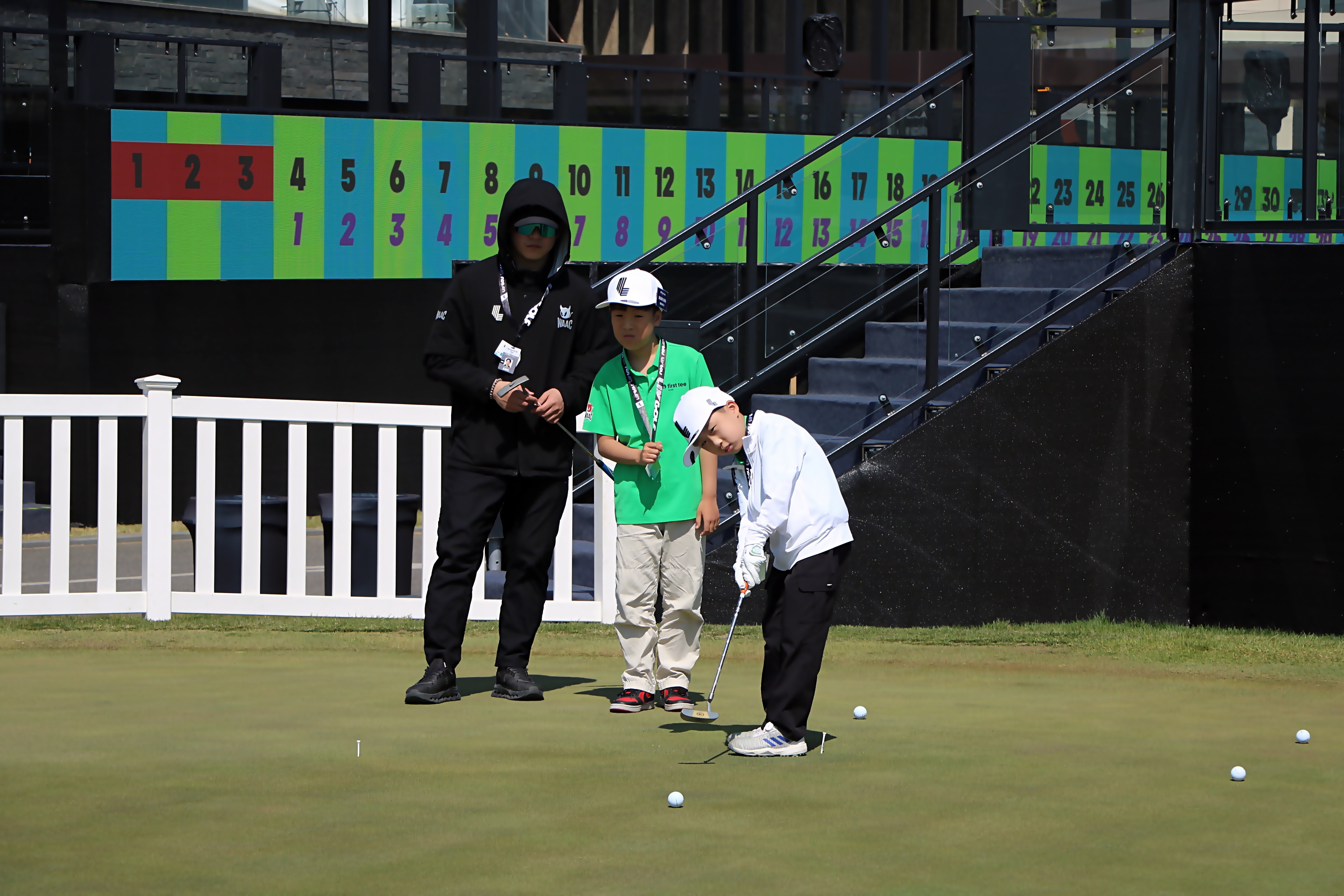 대회에 출전한 선수들이 연습하는 연습그린에서 신중하게 퍼팅게임에 임하고 있는 아이들