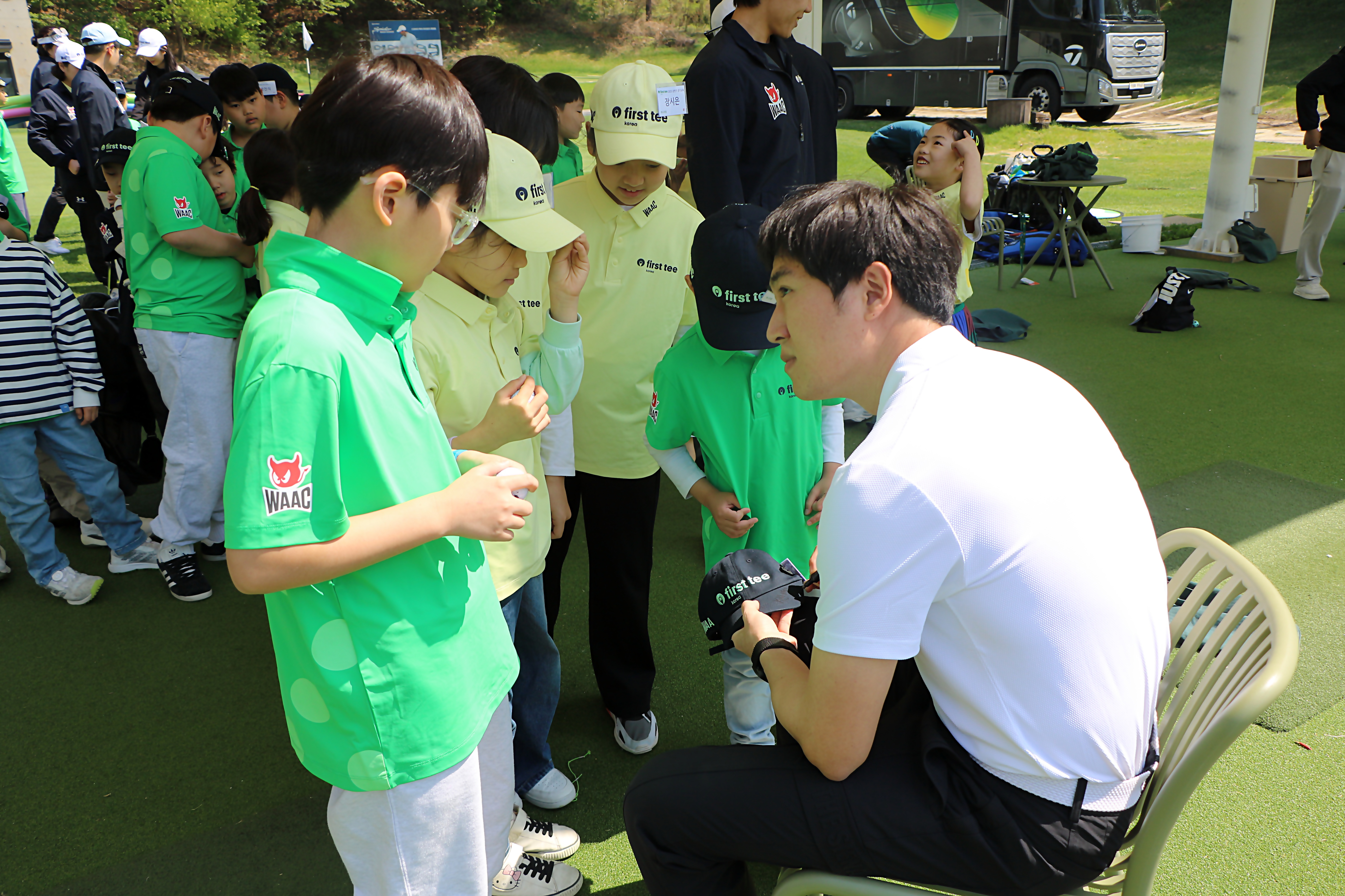직접 아이들의 모자나 종이 등에 사인을 해주며 감사의 마음을 전하고 있는 이동균 프로