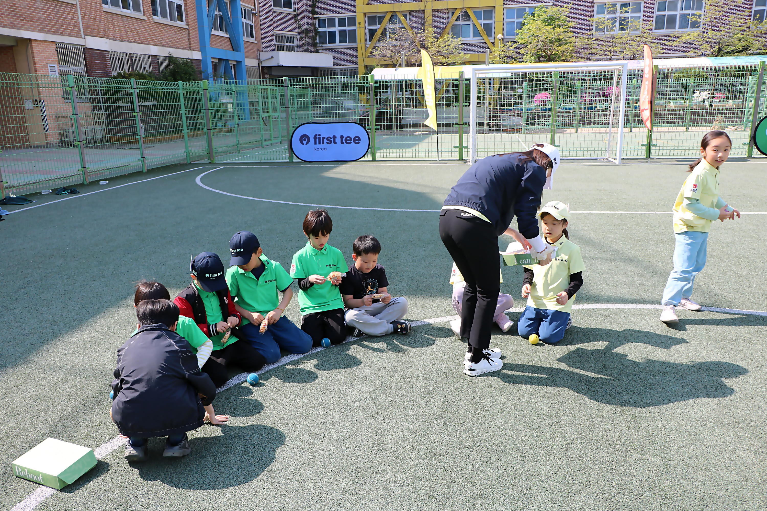 코치님의 간식 선물을 받고 즐거워 하는 아이들