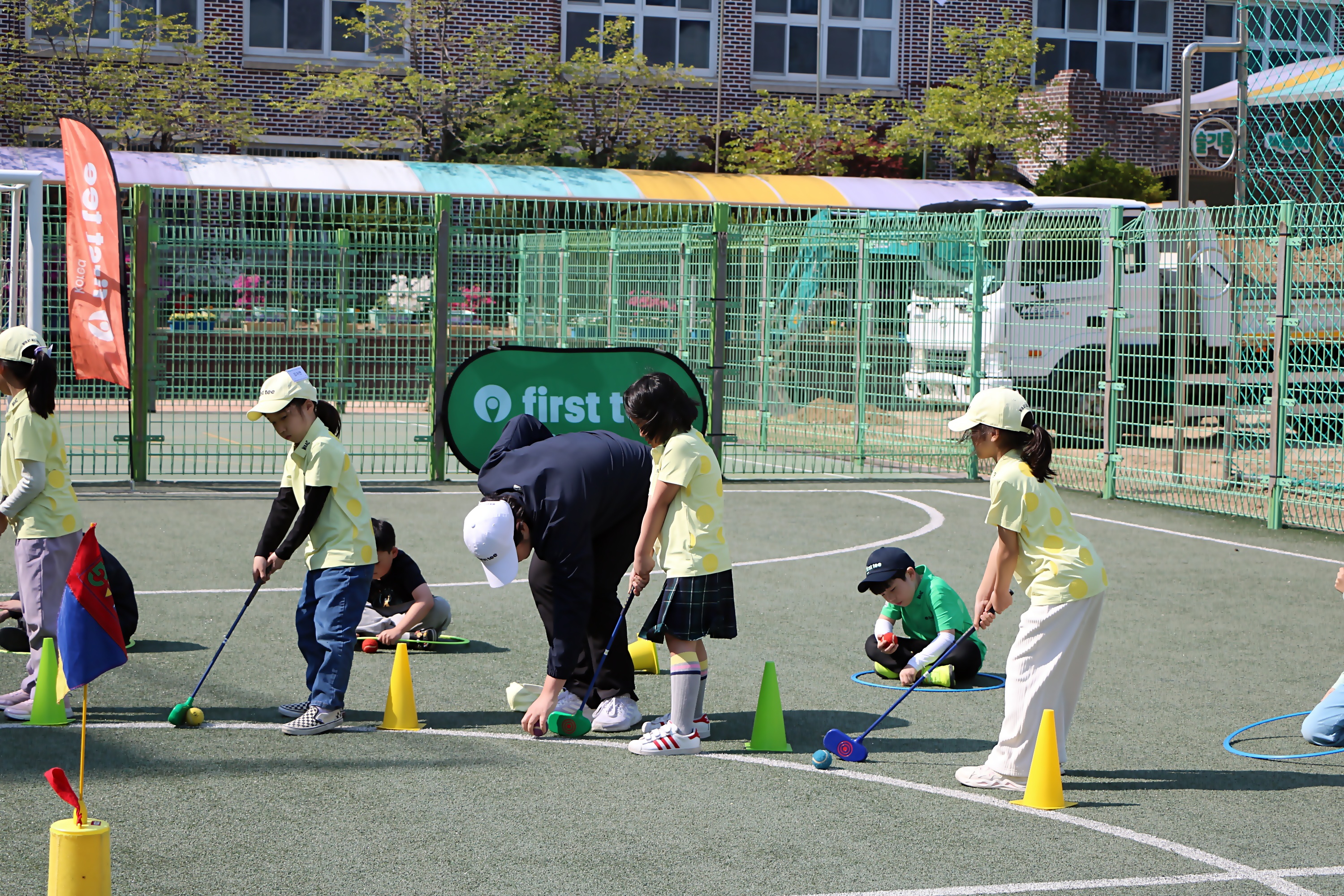 운동장 보수공사 관계로 안전을 위해 지난주에 이어 퍼팅 실습을 하고 있는 아이들