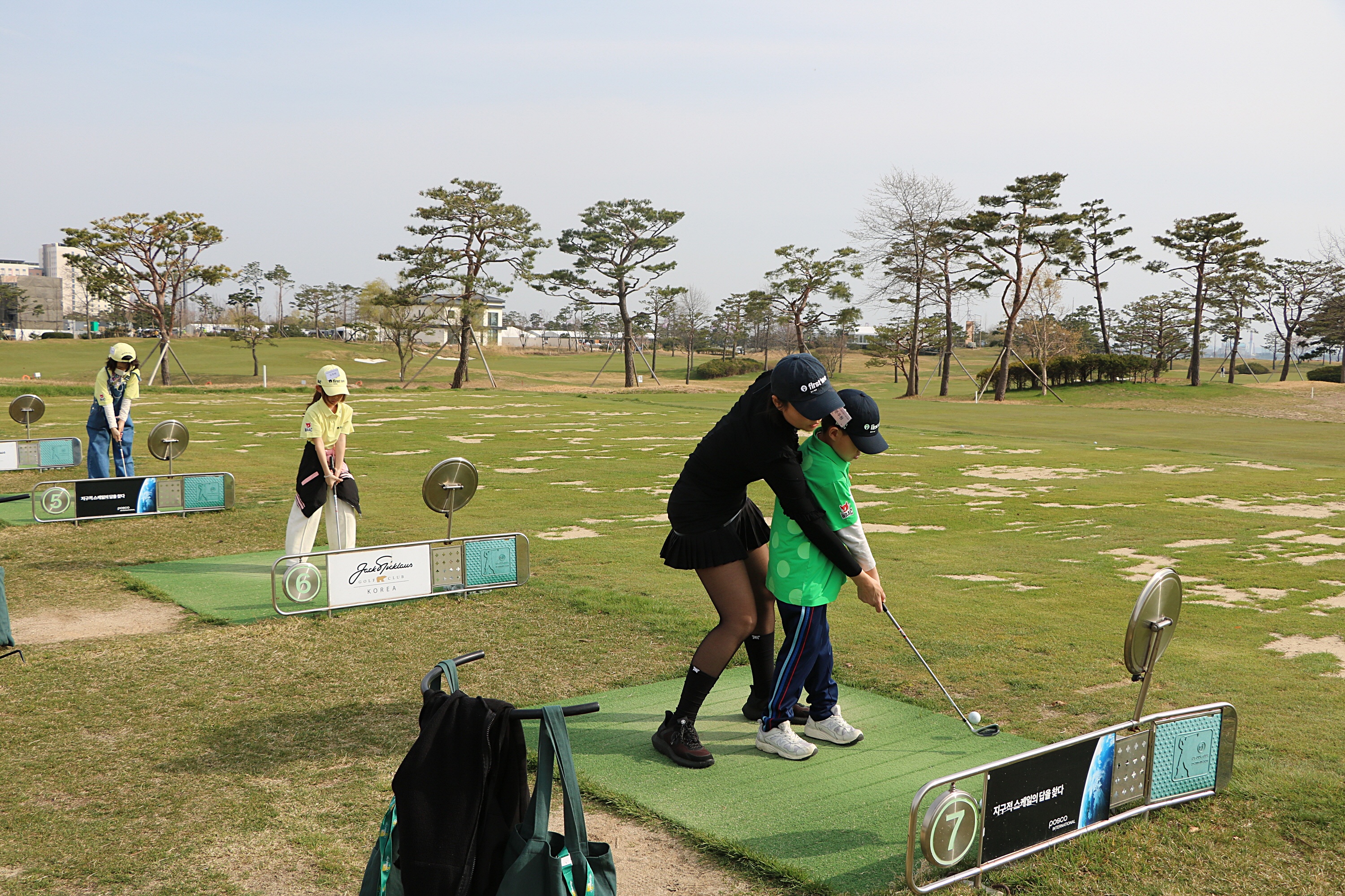 2인 1조로 골프실습을 하는 가운데 순차적으로 아이들을 지도해 주고 있는 모습
