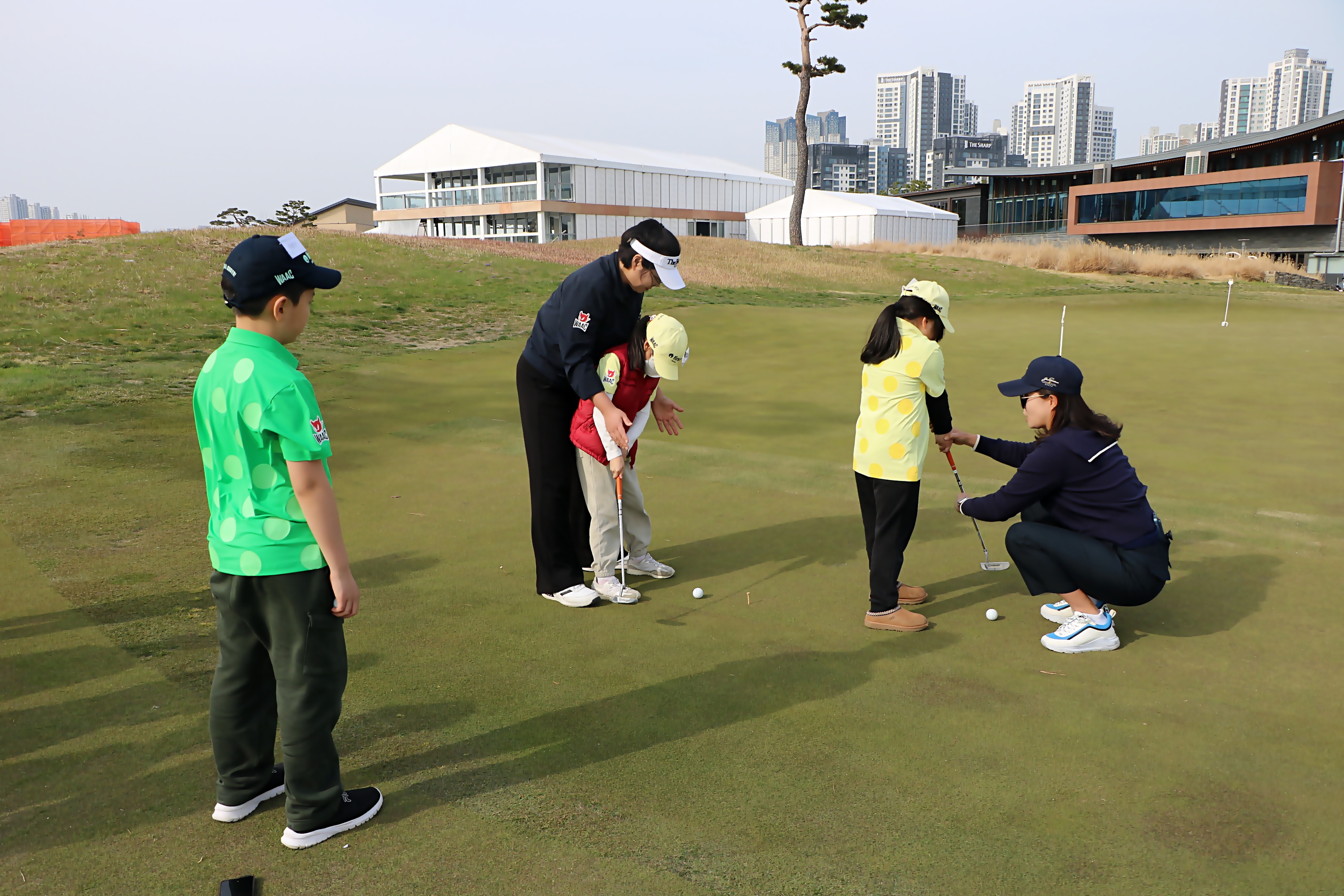 퍼팅실습반(총8명)을 2조로 나눈 뒤 1:1로 퍼팅레슨을 해주고 있는 모습