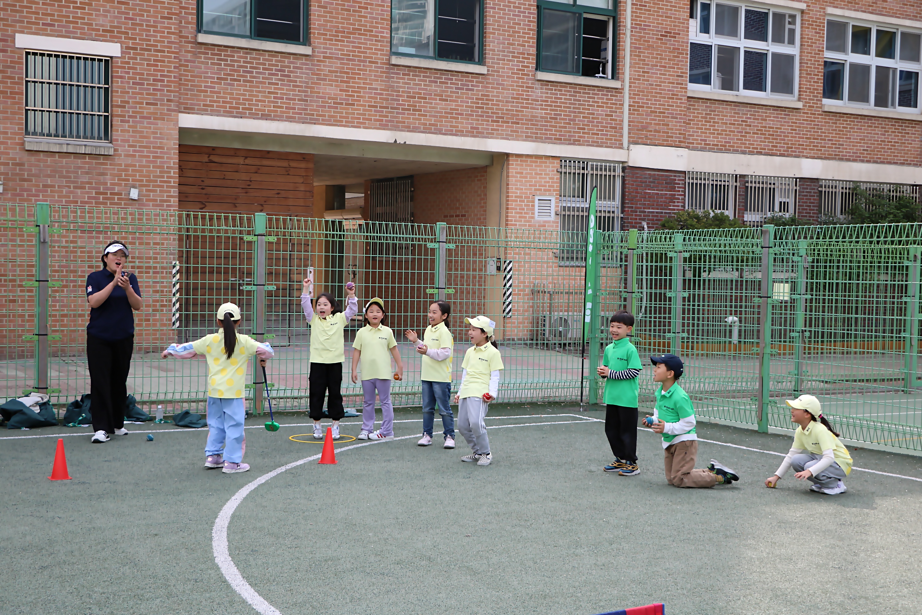 승리를 확정짓는 마지막 퍼팅에 성공한 후 기뻐하는 아이들