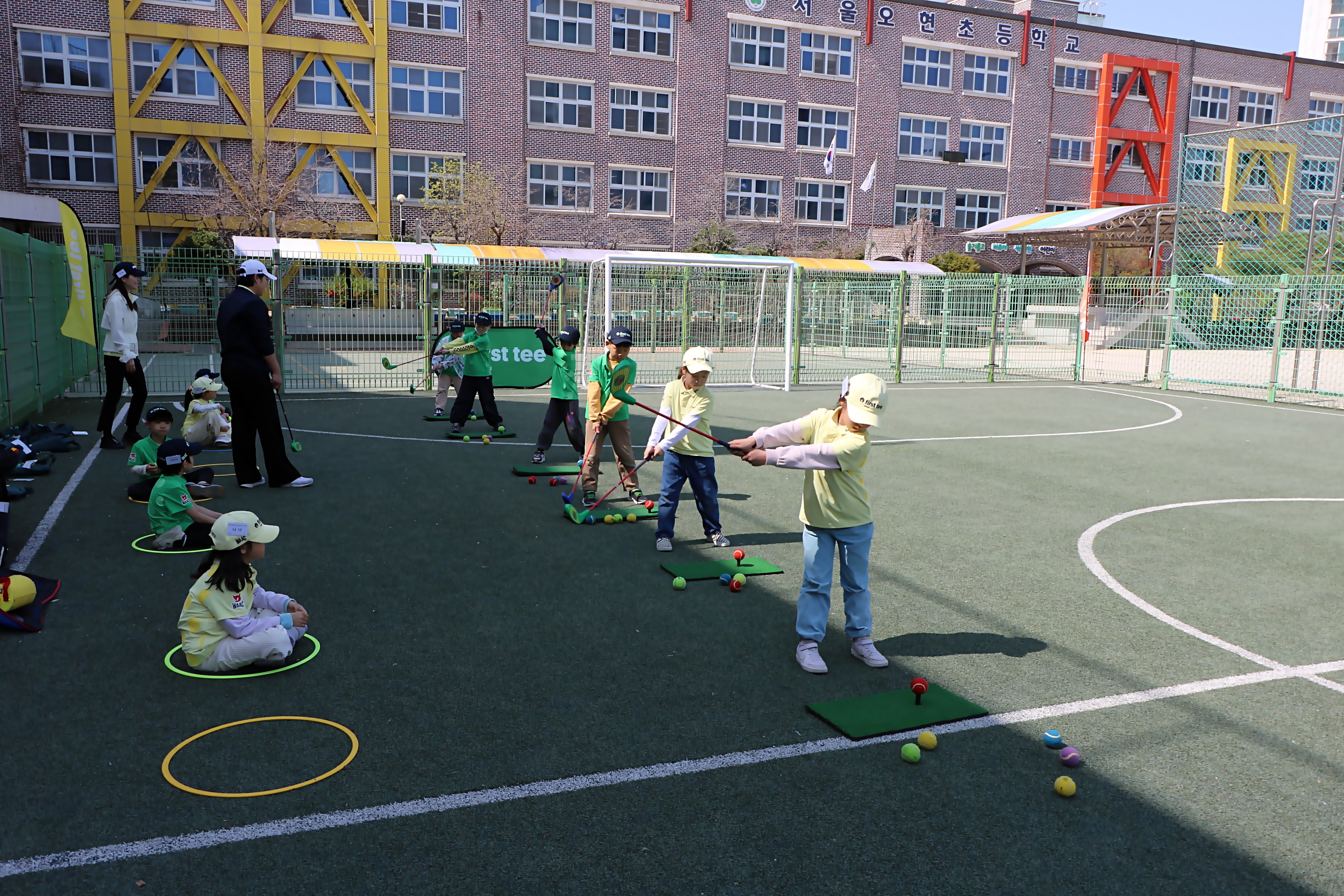 대기조는 안전구역에서! 실습조는 타석에서! 안전한 교육을 위해 반드시 규칙을 지키면서 교대로 골프실습 중인 아이들