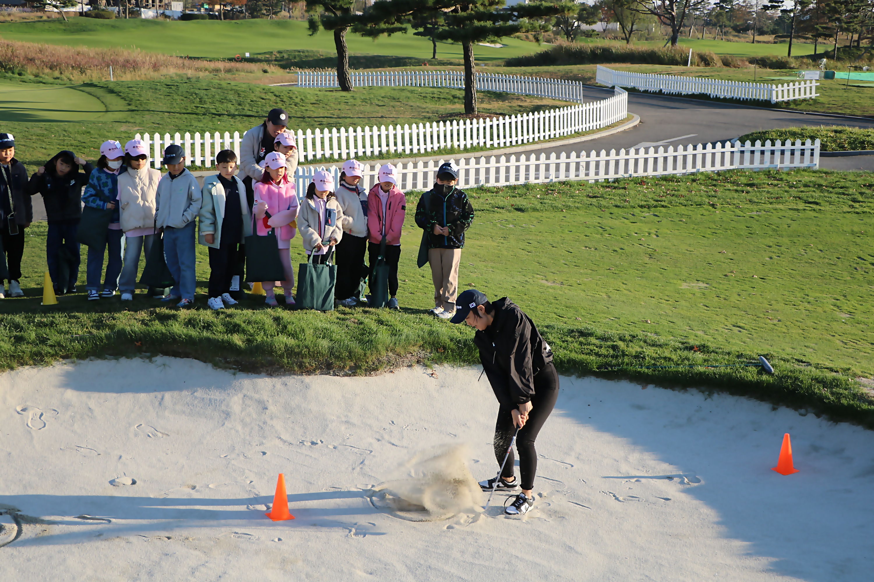 벙커샷 하는 요령에 대해서 시범을 보여주고 있는 모습