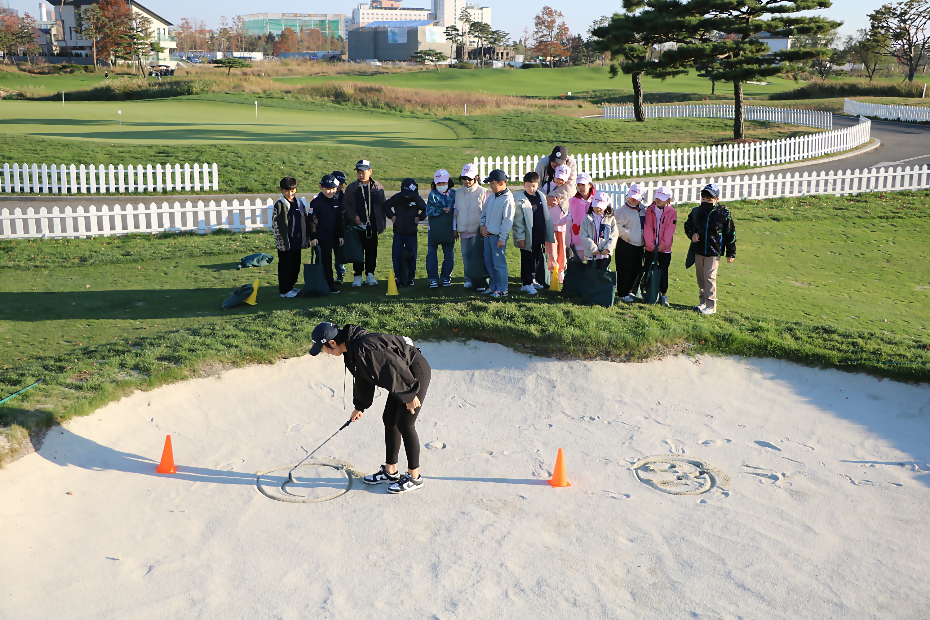 벙커 모래 위에 현재 자신의 기분상태를 다양한 모양으로 그린 후 이것을 지우는 방식으로 벙커샷 실습을 하고 있는 아이들