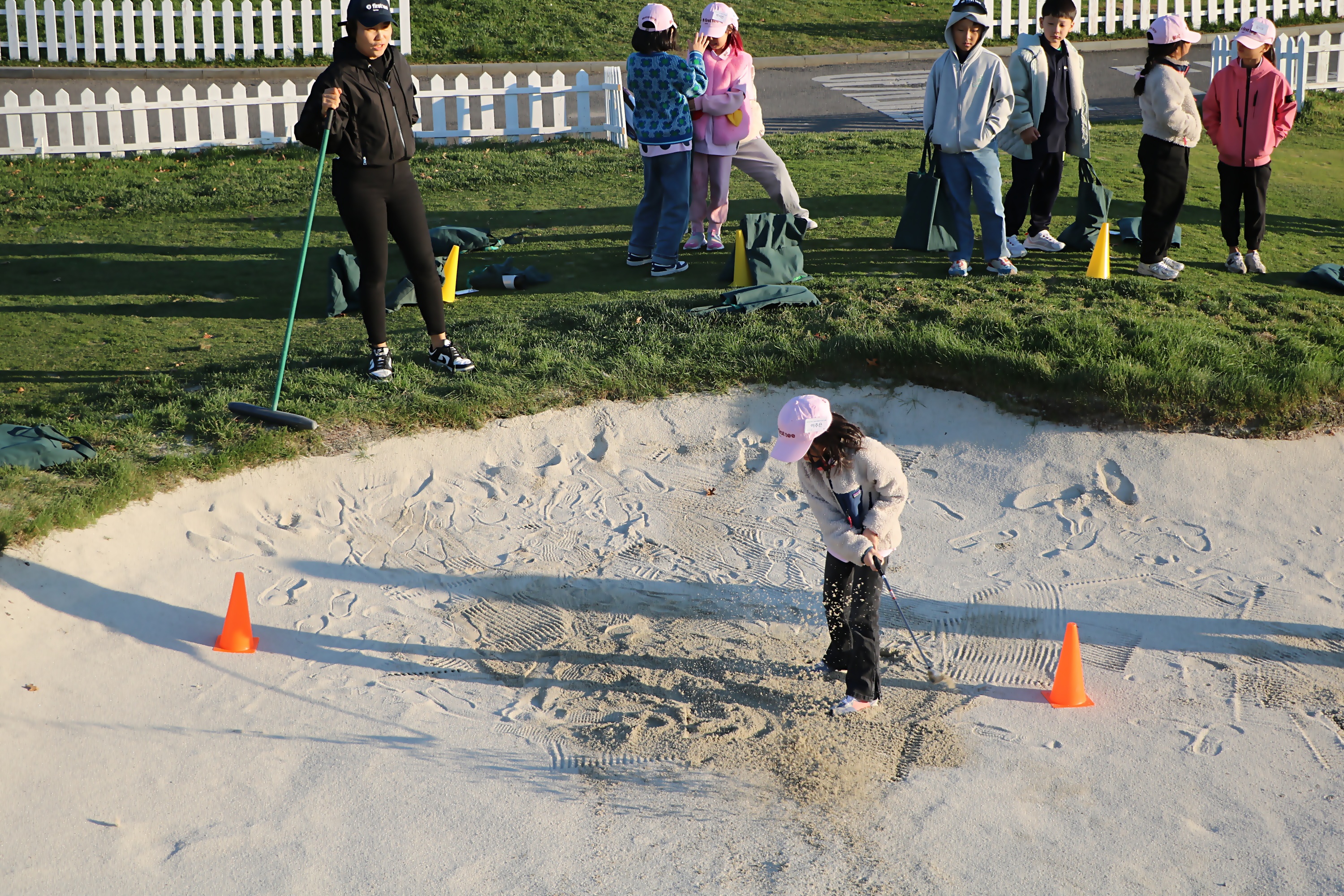 클럽헤드가 평소 샷할 때보다 열려 있어야 벙커에 빼진 공을 쉽게 탈출시킬 수 있다고 설명해 주는 모습