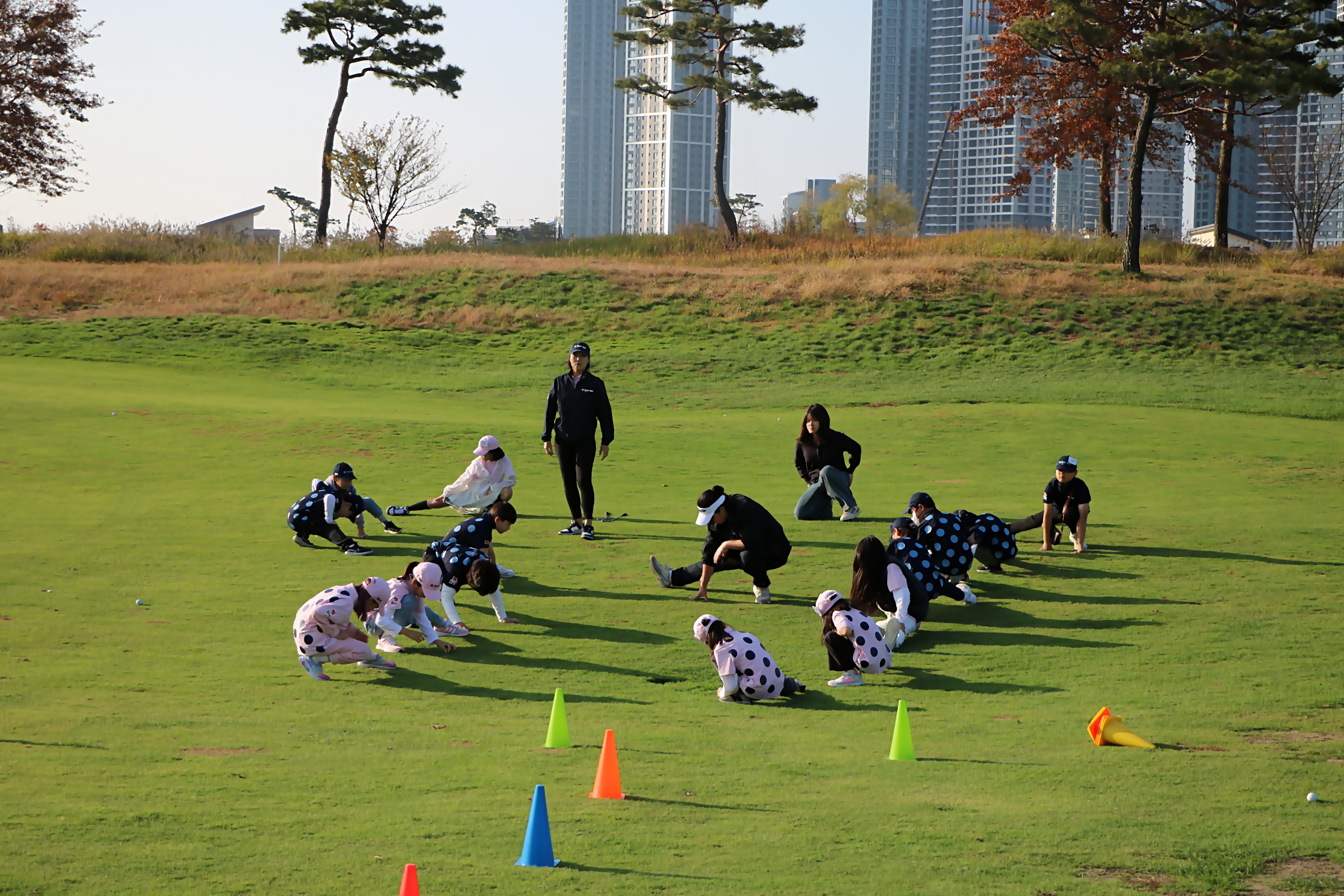 코치님을 따라 스트레칭 동작을 하면서 몸을 풀고 있는 모습