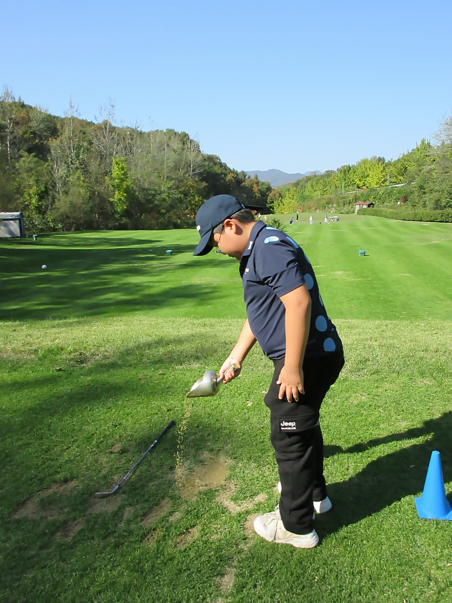 자신이 샷한 자리와 인근에 있는 디봇자국에 보수용 모래를 뿌리면서 코스 내 잔디 보호를 실천하고 있는 모습